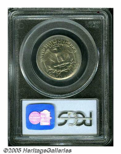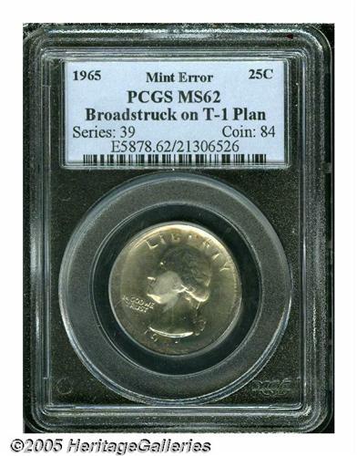 <B>1965<25C Error> Washington Quarter--Broadstruck on Type One Planchet--MS62 PCGS.</B></I> The wide flat rim indicates a Type One planchet. Highly lustrous and lightly toned, an especially attractive and well centered example of this desirable error coin.