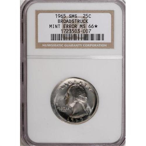 <B>1965 Kennedy Half--Broadstruck--SMS MS66 <img src="/images/star.gif" width="10" height="10" alt="" border="0"> NGC.</B></I> This special mint set half dollar was struck without a collar die to restrain the expansion during the strike. The rims are unusually wide, particularly along the left border, and the legends near the rims exhibit spreading characteristic of a broadstrike. The prooflike fields are satiny and toned powder-blue.<BR><BR><B>Coin Engraver:</B> Gilroy Roberts and Frank Gasparro<BR><BR><b>Shipping:</b> Coins & Currency (<a target="_blank" href="http://www.heritageauctions.com/common/shipping.php">view shipping information</a>)
