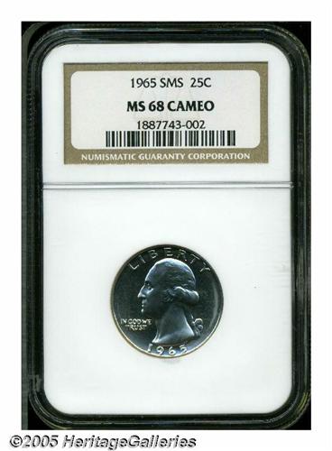 <B>1965<25C> SMS MS68 Cameo NGC.</B></I> Fully impressed and lightly toned, with milky haze in the fields and matte-like devices contrasting against deeply mirrored fields. An appealing example, displaying lovely, sharp contrast.