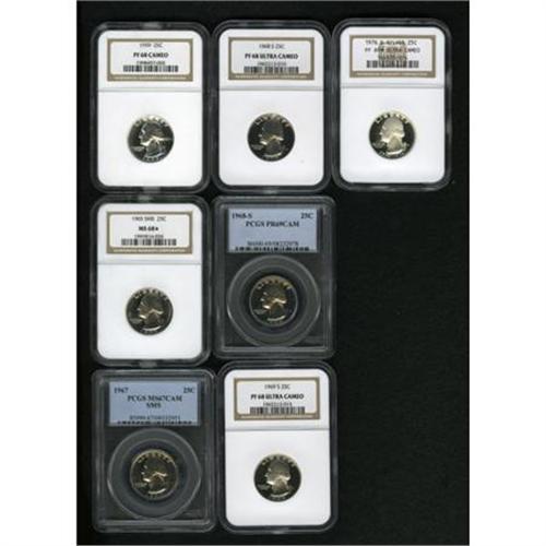 <B>1965 25C SMS MS68<img border='0' src='http://www.heritagecoins.com/images/star.gif' width=10 height=10> NGC; 1967 SMS MS67 Cameo PCGS; 1959 PR68 Cameo NGC; 1968-S PR68 Deep Cameo NGC; 1968-S PR69 Cameo PCGS; 1969-S PR68 Deep Cameo NGC</B></I> and a <B>1976-S Silver PR69<img border='0' src='http://www.heritagecoins.com/images/star.gif' width=10 height=10> Deep Cameo NGC.</B></I><BR><BR><B>Coin Engraver:</B> John Flanagan<BR><BR><b>Shipping:</b> Coin/Currency (<a target="_blank" href="http://www.heritageauctions.com/common/shipping.php">view shipping information</a>\)