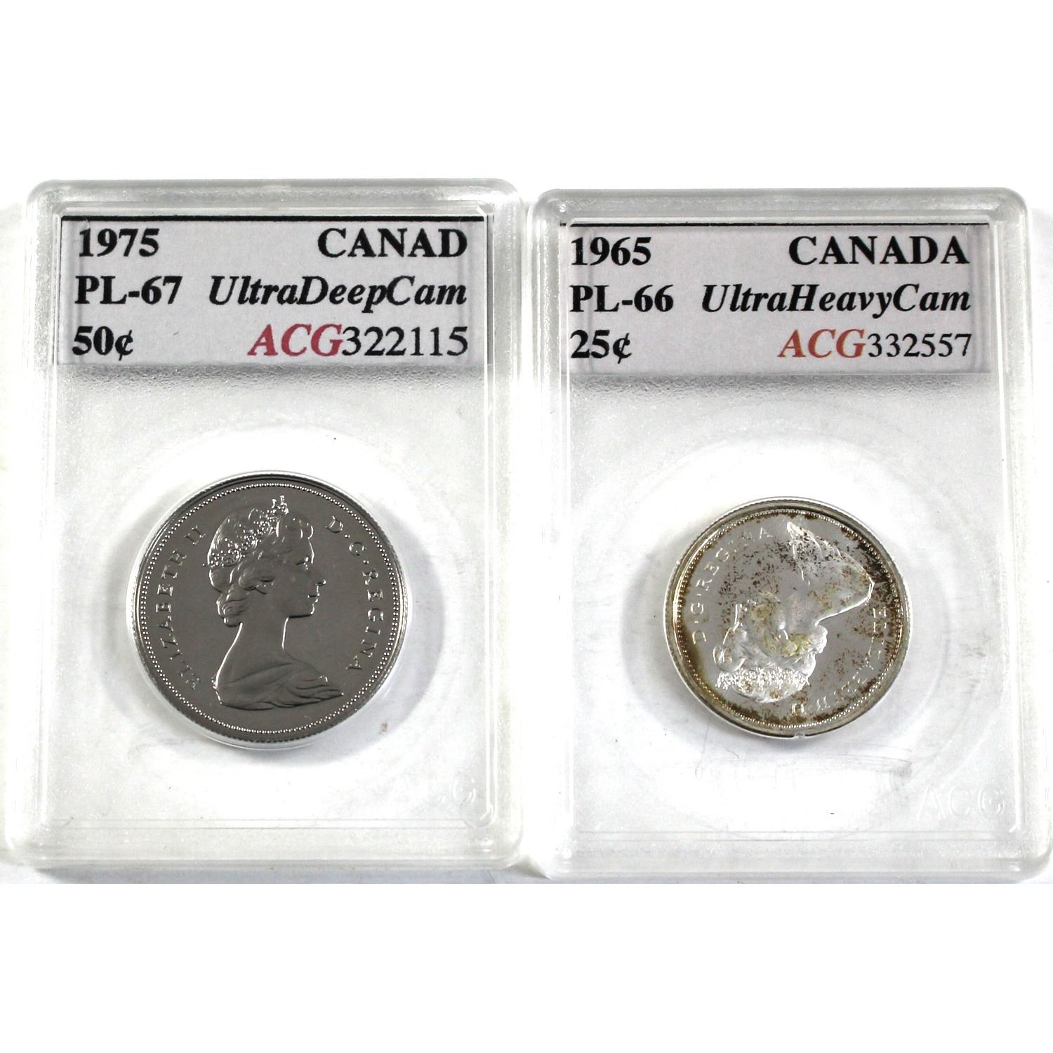 1965 25c PL-66 Ultra Heavy Cameo & 1975 50-cent PL-67 Ultra Deep Cameo ACG Certified. 2pcs