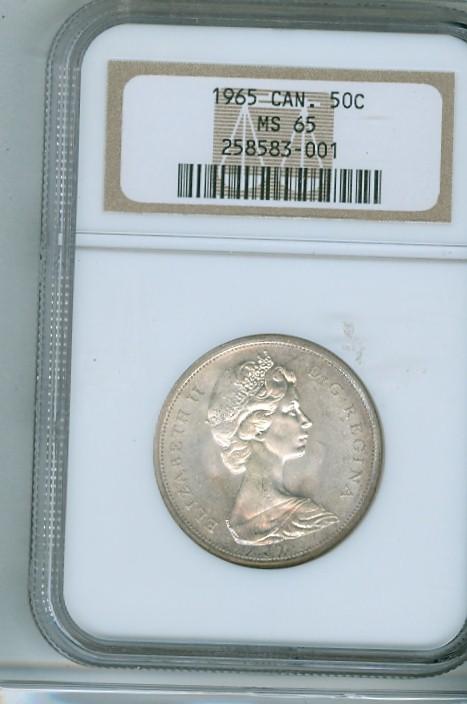 1965 50¢ NGC MS65. White example with light rotation on overse.