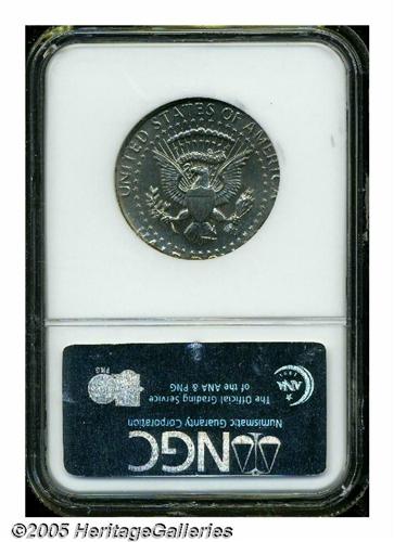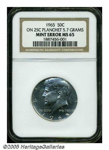 <B>1965<50C> Kennedy Half Dollar--Struck on a 25C Planchet--MS65 NGC.</B></I> 5.7 grams. The weight corresponds to a clad quarter planchet, traces of copper from the core are struck onto the lower right reverse border. An uncentered wrong planchet error, the date is complete, as is nearly all of UNITED STATES OF AMERICA, while most of HALF DOLLAR and the ERT in LIBERTY are off the flan. A satiny Gem with light honey color and splendid preservation. An interesting but relatively small strike-thru affects the eagle's tail feathers.