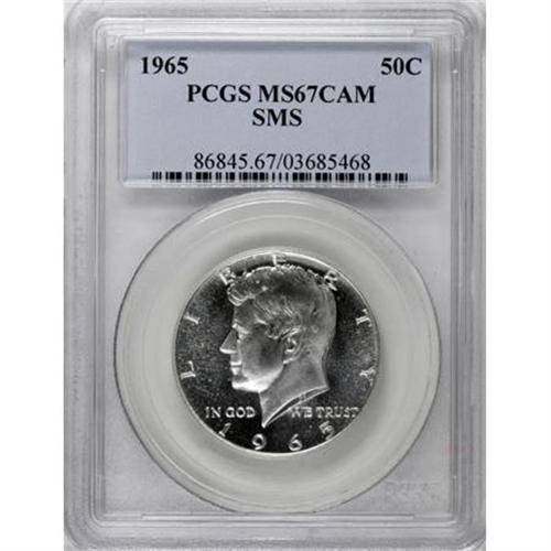 <B>1965 50C SMS MS67 Cameo PCGS.</B></I> . PCGS Population (112/4). NGC Census: (141/18). Numismedia Wsl. Price for NGC/PCGS coin in MS67: $180. (#86845)<BR><BR><b>Shipping:</b> Coins & Currency (<a target="_blank" href="http://www.heritageauctions.com/common/shipping.php">view shipping information</a>)