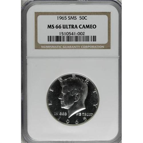 <B>1965 50C SMS MS66 Deep Cameo NGC.</B></I> NGC Census: (5/10). PCGS Population (9/8). Numismedia Wsl. Price for NGC/PCGS coin in MS66: $1,825. (#96845)<BR><BR><b>Shipping:</b> Coins & Currency (<a target="_blank" href="http://www.heritageauctions.com/common/shipping.php">view shipping information</a>)