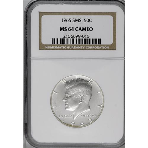 <B>1965<50C> SMS MS64 Cameo NGC.</B></I> Attractive bright mirror fields and boldly frosted Kennedy's head.<BR><I>From The Manna Collection.</B></I> <BR><BR><B>Important notice:</B> Heritage usually auctions material at the rate of 200-250 lots per hour. On some occasions eBay Live bid software or the Internet may not be able to keep up with the pace of the auction. We recommend placing a realistic absentee bid now as insurance to avoid disappointment. Occasionally the auctioneer may eliminate or reject an eBay Live bid, and the auctioneer may also reopen a lot after the close of the eBay live bidding (usually because we missed an audience bid), and may reject your bid even if it shows you as the winning bidder. By bidding via eBay Live, you agree that Heritage may award the lot to another bidder at its sole discretion under the circumstances described above or any other reasonable circumstances. Since eBay bids are not shown to us until we open the lot on the floor, we treat those bids just like floor bids. In most cases the floor responds before the eBay bid is presented to us, due to Internet lag time, so for consistency we have made it a policy that floor bids are always considered first over tie eBay live bids. Also please note that all Heritage lots purchased through eBay Live carry a 20% Buyer's Premium. Please make sure you read the Terms and Conditions before you bid. This lot is being auctioned in conjunction with a live floor auction by Heritage Galleries & Auctioneers. All final auction and invoice information will be supplied by Heritage Galleries & Auctioneers, and all other information should be considered preliminary. Lot:3162 <BR><BR><B>Winning Notification and Billing:</B> After the FINAL session in this auction is complete, Heritage will send e-mail and snail mail invoices. This process normally takes several days. All final auction and invoice information will be supplied by Heritage Galleries & Auctioneers, and all other information should be considered preliminary. <BR><BR>This auction will be conducted on a live auction floor and over the Internet through eBay Live. If you choose to place an absentee bid, please take a moment to <font color='#0000ff'><u><a href='http://pages.ebay.com/liveauctions/help/before/laabsentee.html'>learn how eBay Live absentee bidding works</a></u></font><font color='#000000'>
