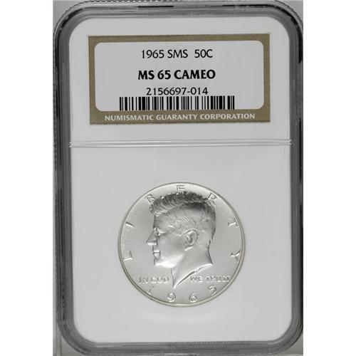 <B>1965<50C> SMS MS65 Cameo NGC.</B></I> A beautiful example of this scarce coin, with good contrast between the fields and devices.<BR><I>From The Manna Collection.</B></I> <BR><BR><B>Important notice:</B> Heritage usually auctions material at the rate of 200-250 lots per hour. On some occasions eBay Live bid software or the Internet may not be able to keep up with the pace of the auction. We recommend placing a realistic absentee bid now as insurance to avoid disappointment. Occasionally the auctioneer may eliminate or reject an eBay Live bid, and the auctioneer may also reopen a lot after the close of the eBay live bidding (usually because we missed an audience bid), and may reject your bid even if it shows you as the winning bidder. By bidding via eBay Live, you agree that Heritage may award the lot to another bidder at its sole discretion under the circumstances described above or any other reasonable circumstances. Since eBay bids are not shown to us until we open the lot on the floor, we treat those bids just like floor bids. In most cases the floor responds before the eBay bid is presented to us, due to Internet lag time, so for consistency we have made it a policy that floor bids are always considered first over tie eBay live bids. Also please note that all Heritage lots purchased through eBay Live carry a 20% Buyer's Premium. Please make sure you read the Terms and Conditions before you bid. This lot is being auctioned in conjunction with a live floor auction by Heritage Galleries & Auctioneers. All final auction and invoice information will be supplied by Heritage Galleries & Auctioneers, and all other information should be considered preliminary. Lot:3163 <BR><BR><B>Winning Notification and Billing:</B> After the FINAL session in this auction is complete, Heritage will send e-mail and snail mail invoices. This process normally takes several days. All final auction and invoice information will be supplied by Heritage Galleries & Auctioneers, and all other information should be considered preliminary. <BR><BR>This auction will be conducted on a live auction floor and over the Internet through eBay Live. If you choose to place an absentee bid, please take a moment to <font color='#0000ff'><u><a href='http://pages.ebay.com/liveauctions/help/before/laabsentee.html'>learn how eBay Live absentee bidding works</a></u></font><font color='#000000'>