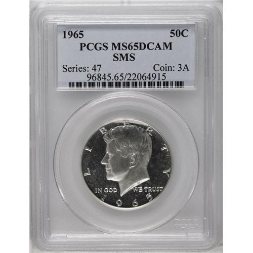 <B>1965<50C> SMS MS65 Deep Cameo PCGS.</B></I> This brilliant Gem benefits from obvious cameo frost throughout the devices. Such quality is not often found on 1965 Special Mint Set pieces, whose mint manufacture was not as thorough as on the 1964 proofs. Interesting die lines (as made) dominate the right upright of the A in STATES. <BR><BR><B>Important notice:</B> Heritage usually auctions material at the rate of 200-250 lots per hour. On some occasions eBay Live bid software or the Internet may not be able to keep up with the pace of the auction. We recommend placing a realistic absentee bid now as insurance to avoid disappointment. Occasionally the auctioneer may eliminate or reject an eBay Live bid, and the auctioneer may also reopen a lot after the close of the eBay live bidding (usually because we missed an audience bid), and may reject your bid even if it shows you as the winning bidder. By bidding via eBay Live, you agree that Heritage may award the lot to another bidder at its sole discretion under the circumstances described above or any other reasonable circumstances. Since eBay bids are not shown to us until we open the lot on the floor, we treat those bids just like floor bids. In most cases the floor responds before the eBay bid is presented to us, due to Internet lag time, so for consistency we have made it a policy that floor bids are always considered first over tie eBay live bids. Also please note that all Heritage lots purchased through eBay Live carry a 20% Buyer's Premium. Please make sure you read the Terms and Conditions before you bid. This lot is being auctioned in conjunction with a live floor auction by Heritage Galleries & Auctioneers. All final auction and invoice information will be supplied by Heritage Galleries & Auctioneers, and all other information should be considered preliminary. Lot:3164 <BR><BR><B>Winning Notification and Billing:</B> After the FINAL session in this auction is complete, Heritage will send e-mail and snail mail invoices. This process normally takes several days. All final auction and invoice information will be supplied by Heritage Galleries & Auctioneers, and all other information should be considered preliminary. <BR><BR>This auction will be conducted on a live auction floor and over the Internet through eBay Live. If you choose to place an absentee bid, please take a moment to <font color='#0000ff'><u><a href='http://pages.ebay.com/liveauctions/help/before/laabsentee.html'>learn how eBay Live absentee bidding works</a></u></font><font color='#000000'>