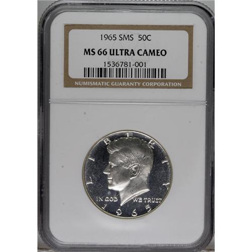 <B>1965 50C SMS MS66 Deep Cameo NGC.</B></I> NGC Census: (5/10). PCGS Population (9/8). (#96845)<BR><BR><b>Shipping:</b> Coin/Currency (<a target="_blank" href="http://www.heritageauctions.com/common/shipping.php">view shipping information</a>)