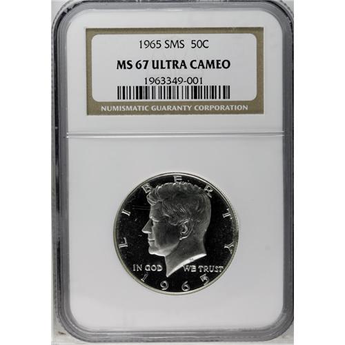<B>1965<50C> SMS MS67 Ultra Cameo NGC.</B></I> Ice-white devices confirm the Ultra Cameo designation for this high quality Special Mint Set example. The prominently mirrored fields are free from hairlines, although a few minute obverse lintmarks are detected. Sharply struck and desirable. Census: 7 in 67 Ultra Cameo, none finer (7/06).