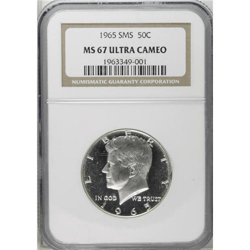 <B>1965<50C> SMS MS67 Ultra Cameo NGC.</B></I> Ice-white devices confirm the Ultra Cameo designation for this high quality Special Mint Set example. The prominently mirrored fields appear to have been heavily basined and certainly resemble those of a proof, although the mint was trying to actively discourage collectors in 1965 and the SMS coins were allegedly a step down from actual proofs. The coin is brilliant throughout and the contrast between fields and devices is strong enough that it resembles the finish on later date proofs when the mint actually tried to produce proofs that look like this. In this case, it was accidental that such a piece was produced from new dies. Simply outstanding quality. Census: 8 in 67 Ultra Cameo, none finer (7/06).