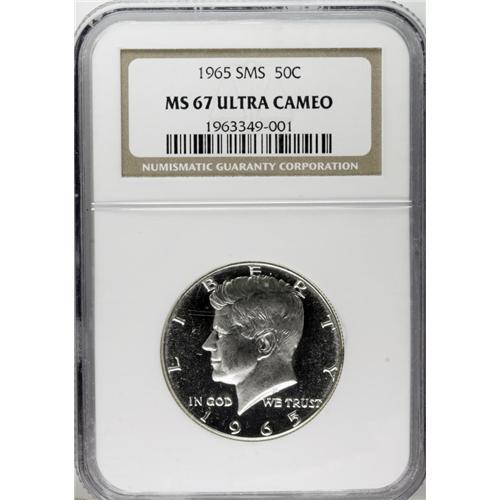 <B>1965 50C SMS MS67 Ultra Cameo NGC.</B></I> Ice-white devices confirm the Ultra Cameo designation for this high quality Special Mint Set example. The prominently mirrored fields appear to have been heavily basined and certainly resemble those of a proof, although the mint was trying to actively discourage collectors in 1965 and the SMS coins were allegedly a step down from actual proofs. The coin is brilliant throughout and the contrast between fields and devices is strong enough that it resembles the finish on later date proofs when the mint actually tried to produce proofs that look like this. In this case, it was accidental that such a piece was produced from new dies. Simply outstanding quality. Census: 8 in 67 Ultra Cameo, none finer (10/06).<BR><BR><b>Shipping:</b> Coin/Currency (<a target="_blank" href="http://www.heritageauctions.com/common/shipping.php">view shipping information</a>)