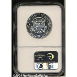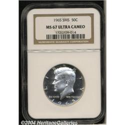 <B>1965<50C> SMS MS67 Ultra Cameo NGC.</B></I> A pronounced cameo contrast is present on both the obverse and the reverse. The surfaces are nearly untoned, revealing just a faint hint of speckled milky color in the fields. A small luster graze is noted on Kennedy's cheek, but it does not detract from the coin's overall eye appeal. Population: 4 in 67, 0 finer (6/04). <BR><BR><B>Important notice:</B> Heritage usually auctions material at the rate of 200-250 lots per hour. On some occasions eBay Live bid software or the Internet may not be able to keep up with the pace of the auction. We recommend placing a realistic absentee bid now as insurance to avoid disappointment. Occasionally the auctioneer may eliminate or reject an eBay Live bid, and the auctioneer may also reopen a lot after the close of the eBay live bidding (usually because we missed an audience bid), and may reject your bid even if it shows you as the winning bidder. By bidding via eBay Live, you agree that Heritage may award the lot to another bidder at its sole discretion under the circumstances described above or any other reasonable circumstances. Since eBay bids are not shown to us until we open the lot on the floor, we treat those bids just like floor bids. In most cases the floor responds before the eBay bid is presented to us, due to Internet lag time, so for consistency we have made it a policy that floor bids are always considered first over tie eBay live bids. Also please note that all Heritage lots purchased through eBay Live carry a 20% Buyer's Premium. Please make sure you read the Terms and Conditions before you bid. </span></font></tr></table></td></tr></table>