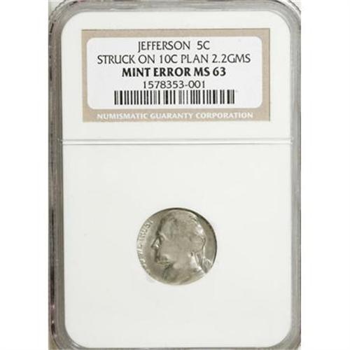 <B>Undated Jefferson Nickel--Struck on a Clad 10C Planchet--MS63 NGC. </B></I>2.2 gm.<BR><BR><B>Coin Engraver:</B> Felix Schlag<BR><BR><b>Shipping:</b> Coins & Currency (<a target="_blank" href="http://www.heritageauctions.com/common/shipping.php">view shipping information</a>)