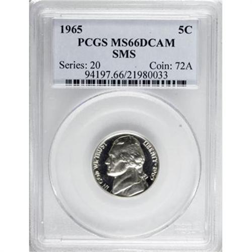 <B>1965 5C SMS MS66 Deep Cameo PCGS.</B></I> Strongly lustrous with deep contrast. A coin such as this essentially untoned beauty is as close as one can come to a proof nickel for the year. The surfaces have few marks overall, though scattered planchet flaws appear in the fields and on the jawline. Population: 16 in 66 Deep Cameo, 5 finer (7/07).<BR><BR><b>Shipping:</b> Coins & Currency (<a target="_blank" href="http://www.heritageauctions.com/common/shipping.php">view shipping information</a>)