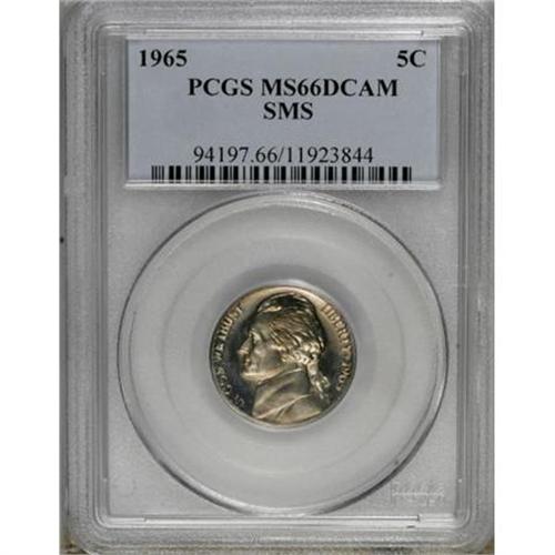 <B>1965 5C SMS MS66 Deep Cameo PCGS.</B></I> The special mint sets of 1965 to 1967 were intended to have quality in-between commercial strikes and the pre-1965 proofs. But certain SMS pieces, such as the present Premium Gem, greatly resemble full-fledged proofs. Light gold toning visits frosted devices and glassy fields. Population: 16 in 66 Deep Cameo, 5 finer (1/08).<BR><BR><b>Shipping:</b> Coins & Currency (<a target="_blank" href="http://www.heritageauctions.com/common/shipping.php">view shipping information</a>)
