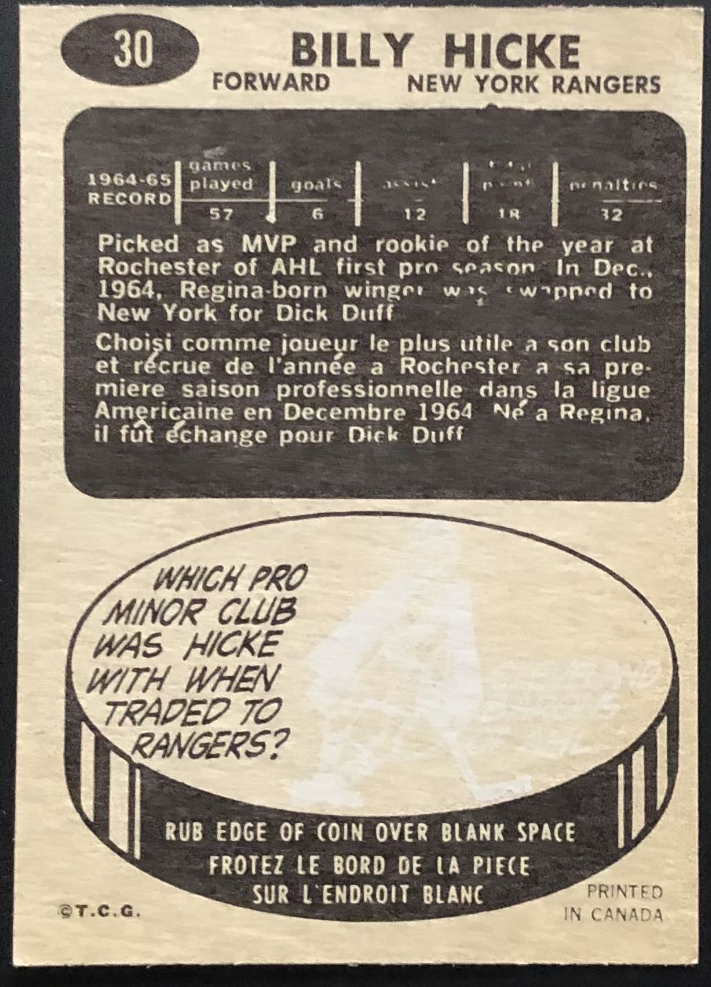 Card #30 NHL, hockey, vintage, OPC, rookie