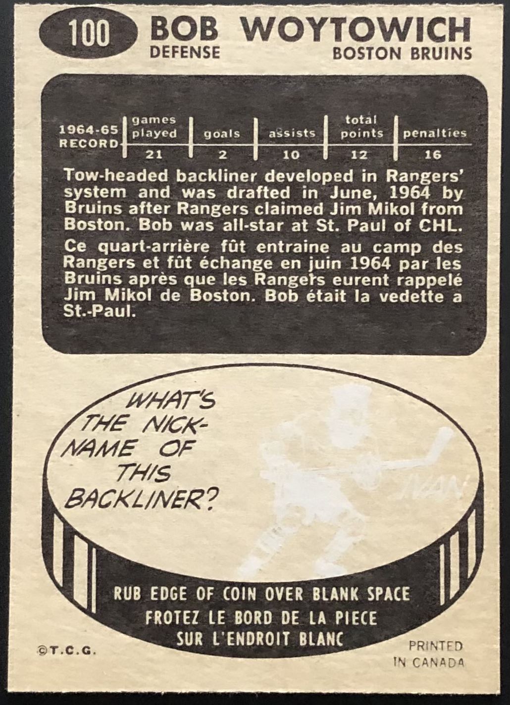 Card #100 NHL, hockey, vintage, OPC, rookie