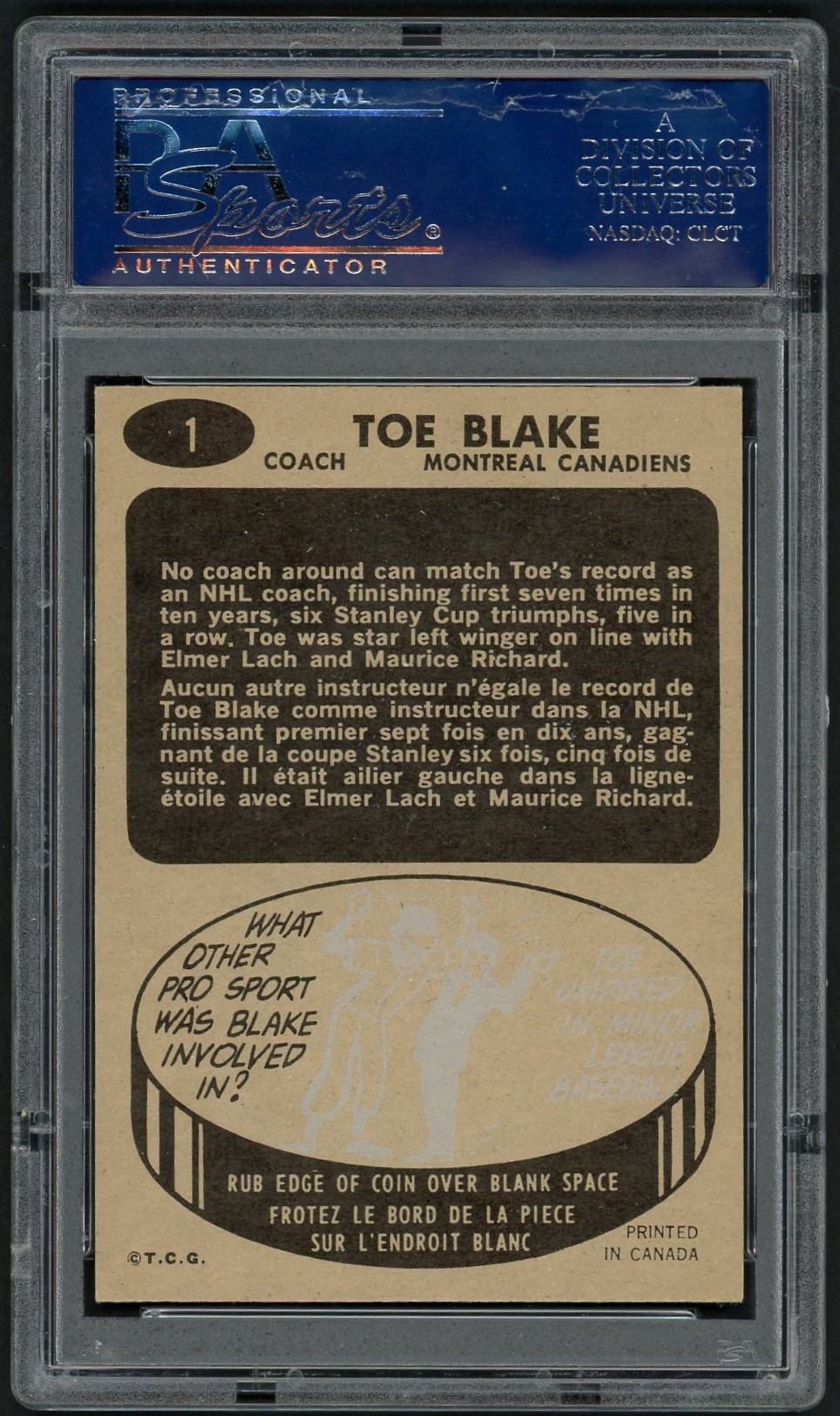 Legendary HOFer Toe Blake, who was not only a star player in his time but also one of the most successful coaches in NHL history, got the #1 card in this classic set. Graded 5 EX by PSA!