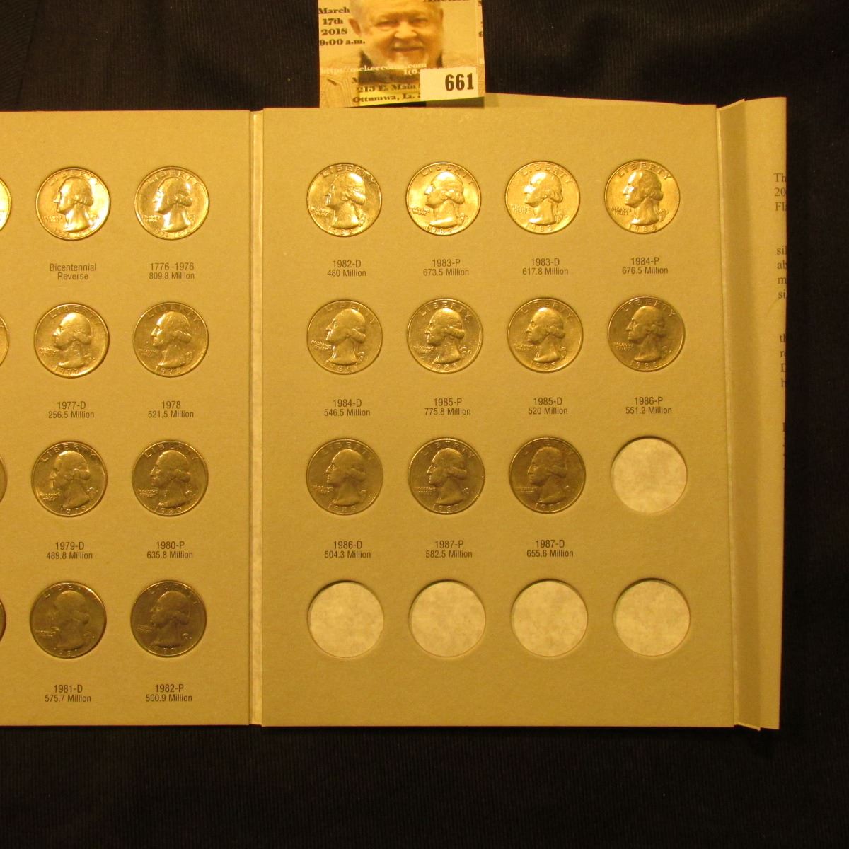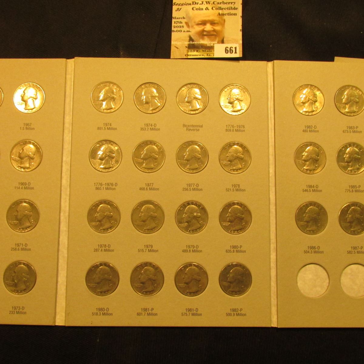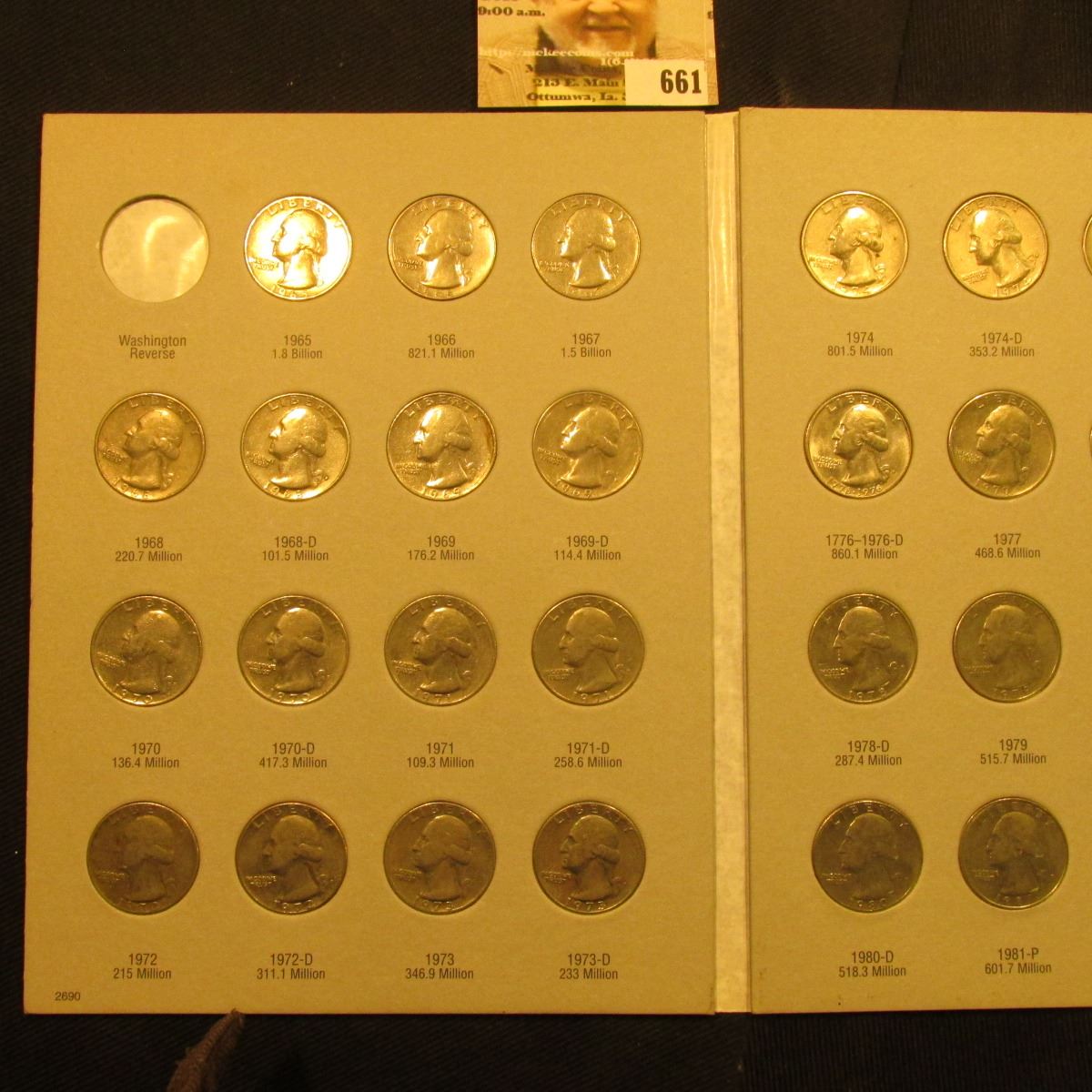 1965-87D Complete Set of U.S. Washington Quarters in a blue Whitman folder exhibited in an attractive Harris Folder. ($10.50 face value).