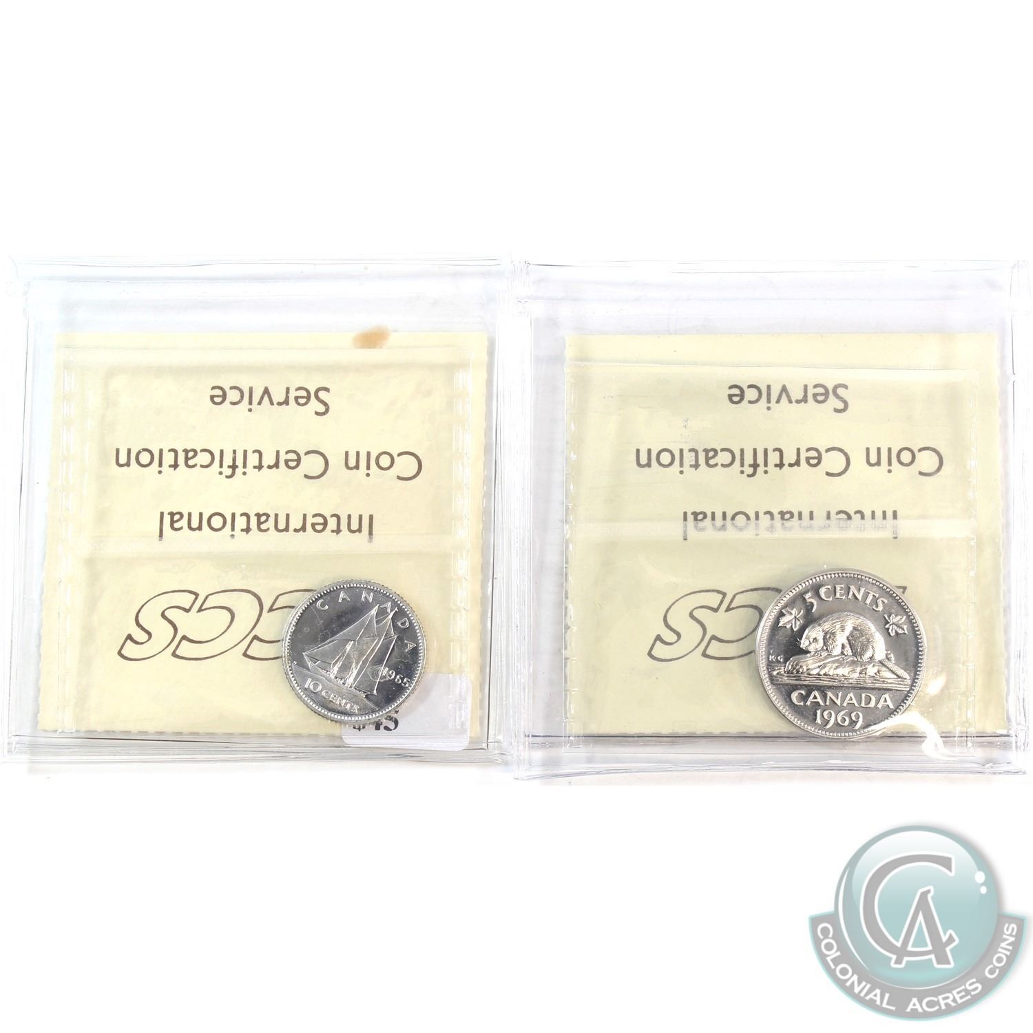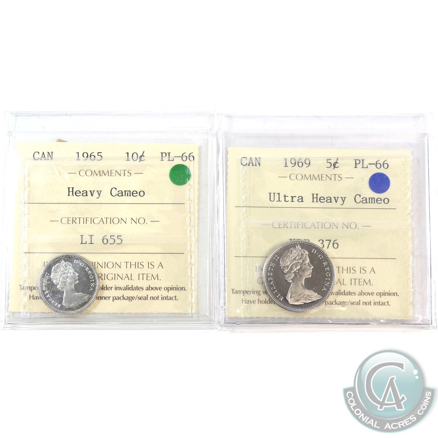1965 Canada 10-cent Heavy Cameo & 1969 Canada 5-cent Ultra Heavy Cameo both ICCS Certified PL-66. 2pcs