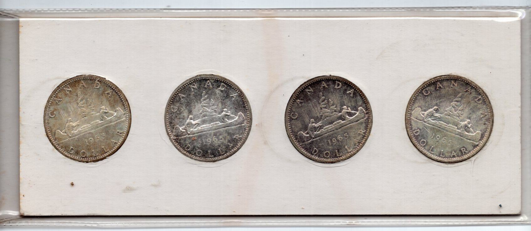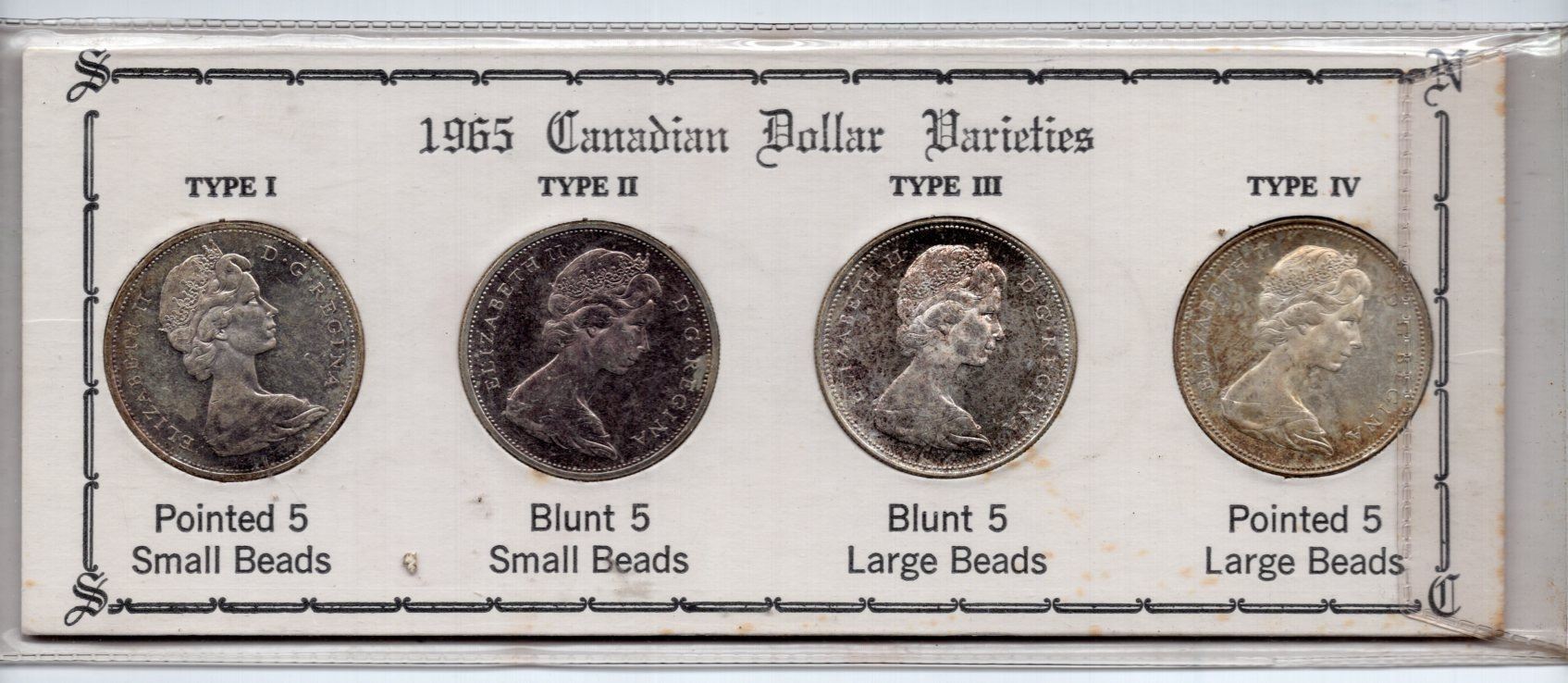Canadian Dollar Varieties Type 1, 2, 3, & 4 on collector card.