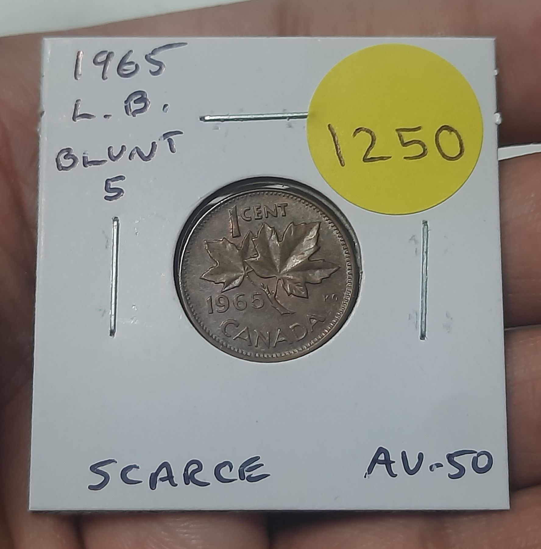 1965 Canadian Large Beads, Blunt 5 Small Cent. AU-50. Scarce.