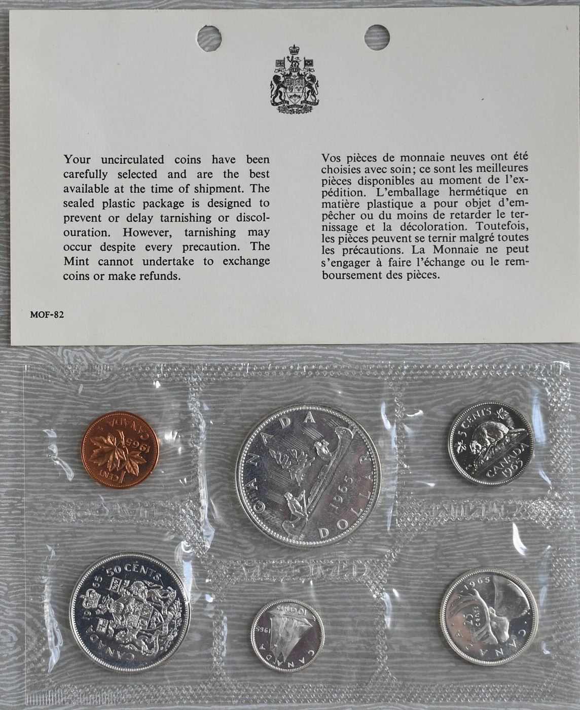 1965 Canadian Prooflike Silver Set. The Canadian Proof Like Mint Set is minted by the Royal Canadian Mint. It comes in it original packaging and COA. 6 coins that are uncirculated Canadian coins in which 4 are made with 80% silver 20% copper alloy. This product contains approximately 1.11 troy ounces of fine silver: 1 Canadian Silver Dollar – 80% Silver – Weight: 23.33 g. 1 Canadian Silver 50 Cent Piece – 80% Silver – Weight: 11.66 g. 1 Canadian Silver 25 Cent Piece – 80% Silver – Weight: 5.83 g. 1 Canadian Silver 10 Cent Piece – 80% Silver – Weight: 2.31 g. 1 Canadian Nickel 5 Cent Piece – Weight: 4.59 g. 1 Canadian Bronze Penny – Weight: 3.24 g
