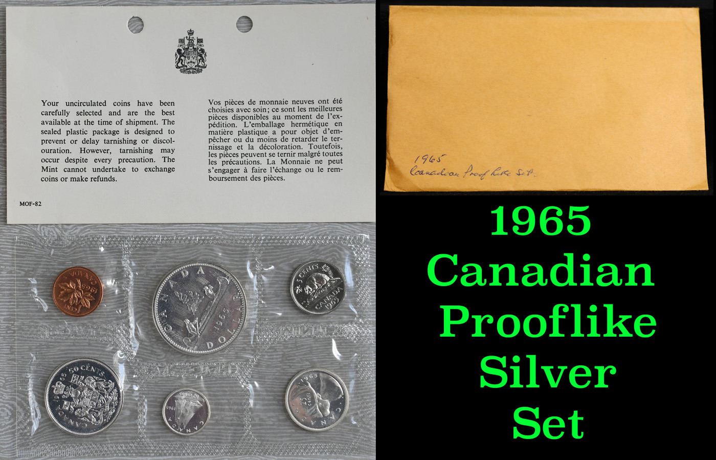 1965 Canadian Prooflike Silver Set. The Canadian Proof Like Mint Set is minted by the Royal Canadian Mint. It comes in it original packaging and COA. 6 coins that are uncirculated Canadian coins in which 4 are made with 80% silver 20% copper alloy. This product contains approximately 1.11 troy ounces of fine silver: 1 Canadian Silver Dollar – 80% Silver – Weight: 23.33 g. 1 Canadian Silver 50 Cent Piece – 80% Silver – Weight: 11.66 g. 1 Canadian Silver 25 Cent Piece – 80% Silver – Weight: 5.83 g. 1 Canadian Silver 10 Cent Piece – 80% Silver – Weight: 2.31 g. 1 Canadian Nickel 5 Cent Piece – Weight: 4.59 g. 1 Canadian Bronze Penny – Weight: 3.24 g