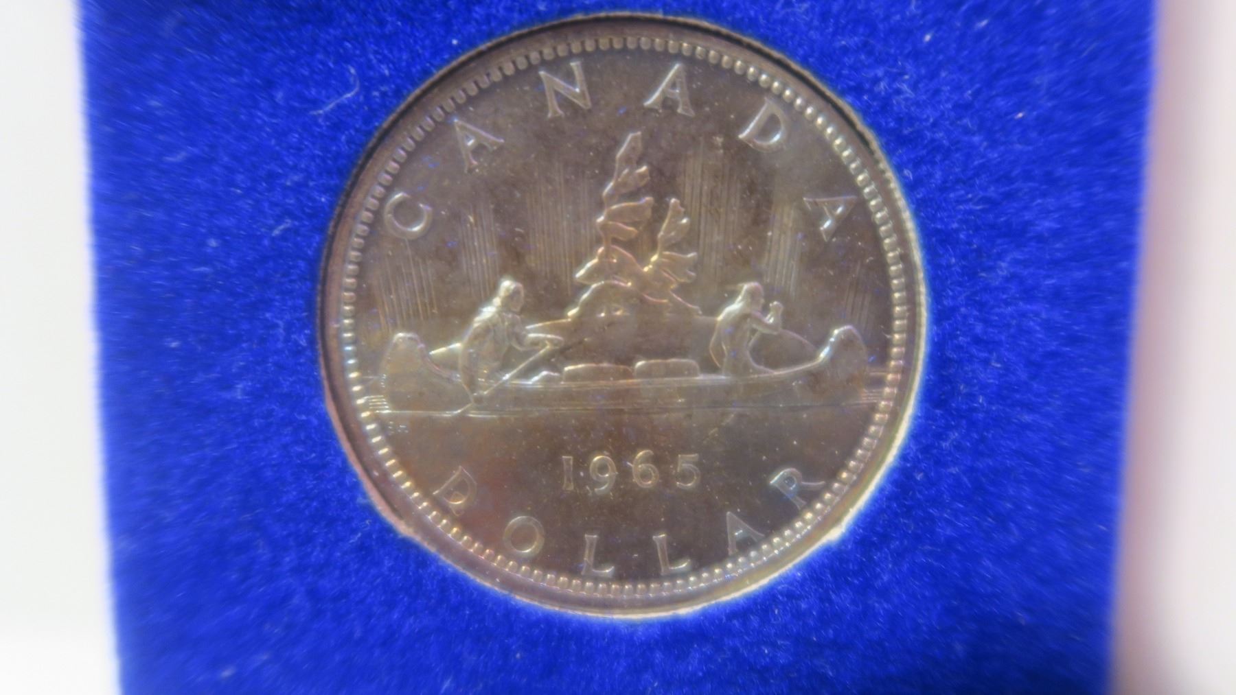 1965 Canadian Silver Dollar. Magnificently Toned and housed in its Royal Trust Box of issue.