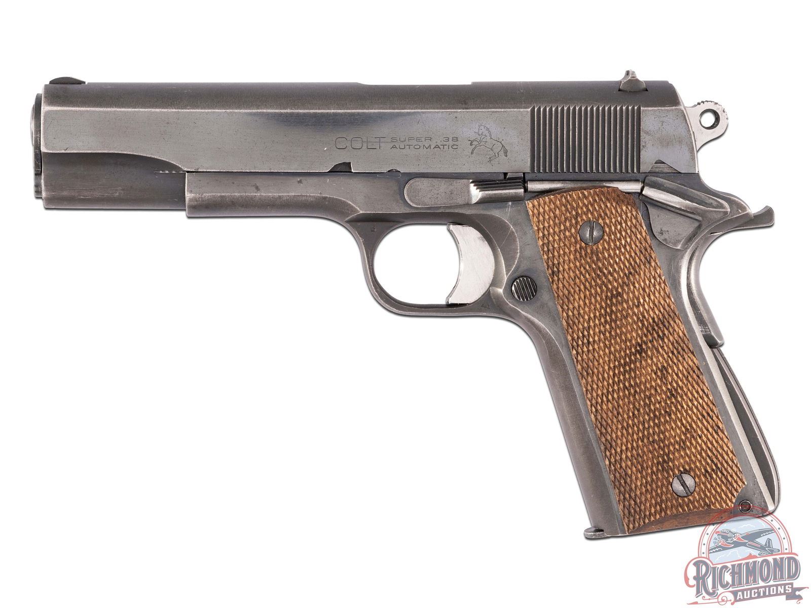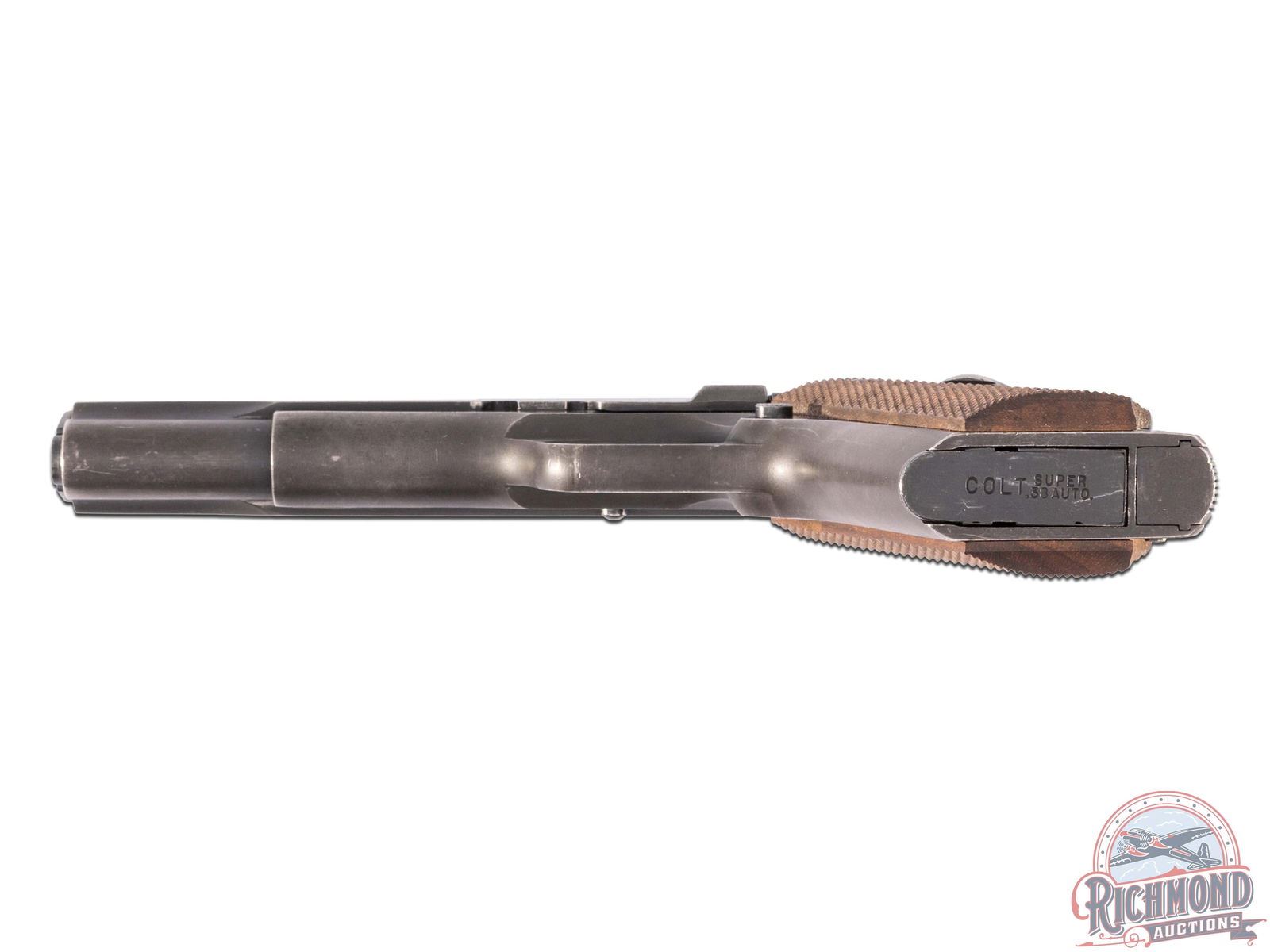 Manufactured in 1965. This Super 38 features a 5" factory barrel with period correct iron sights. Full size 1911 with a blued finish chambered for the .38 Super Auto cartridge. Left side of the slide is stamped "COLT / SUPER .38 / AUTOMATIC" with Rampant Colt logo. Manual thumb safety and grip safety. Fitted with checkered walnut grip panels. Includes Colt factory 8 round magazine. CALIBER: 38 Super. S/N: 176266. FFL STATUS: Curio & Relic.