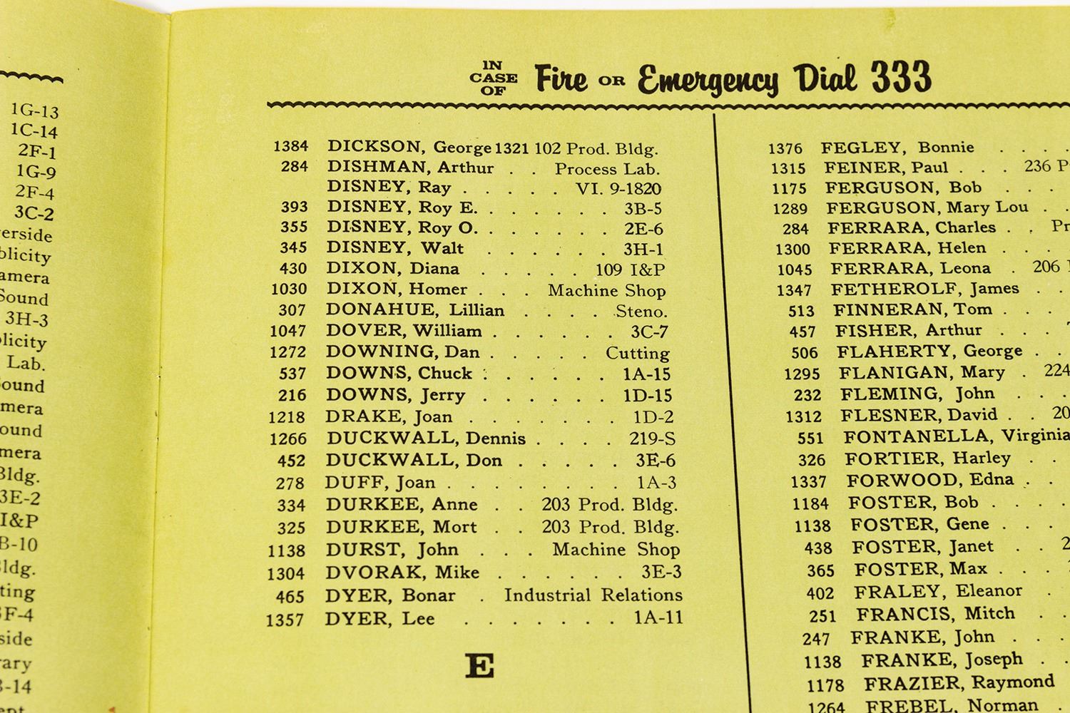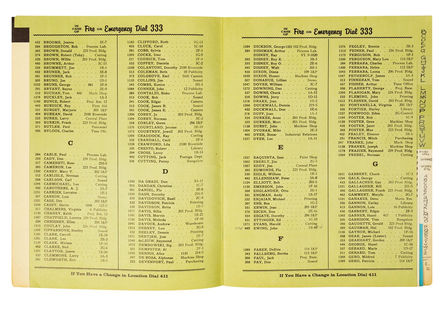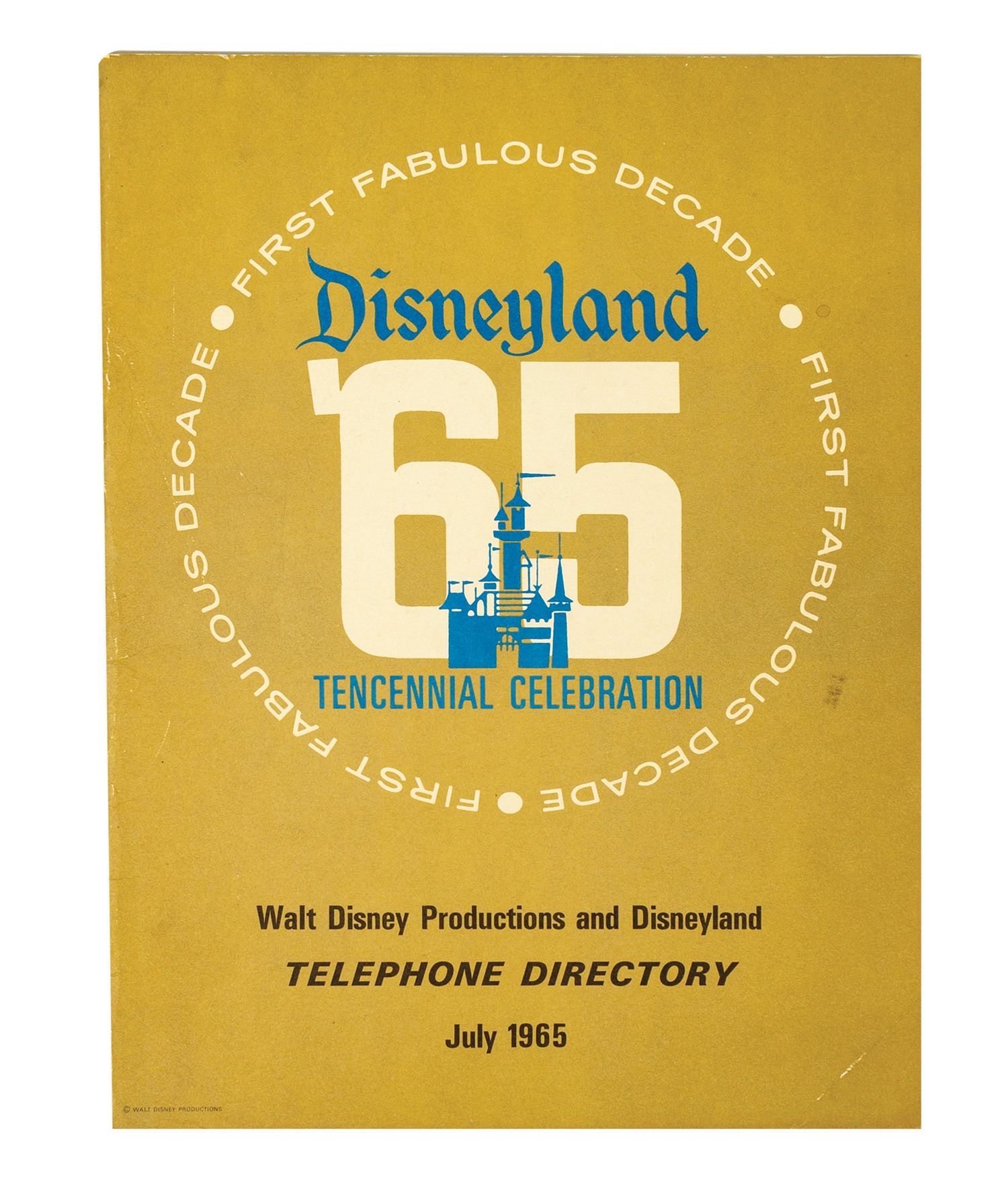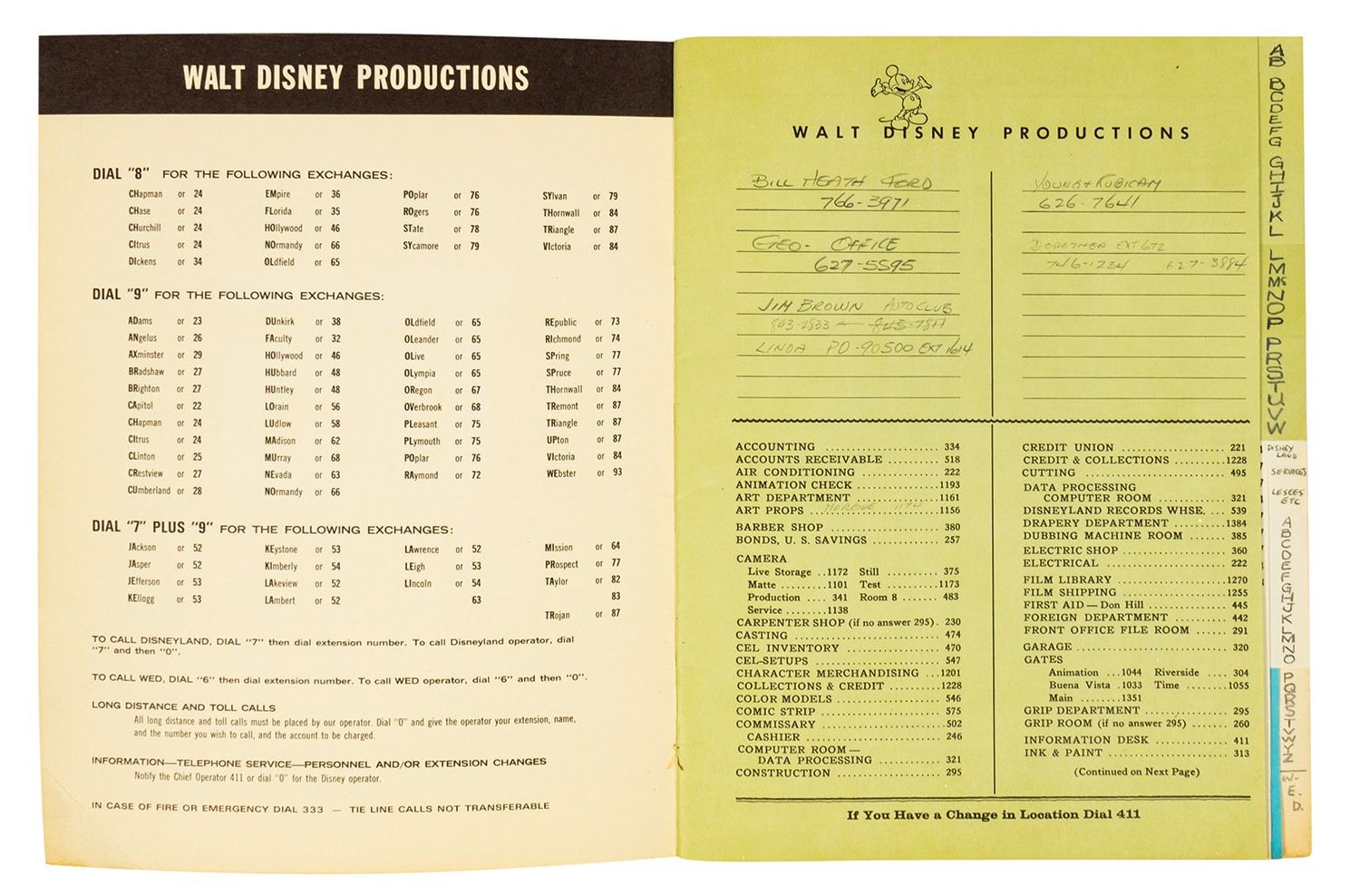 (Disneyland, 1965) A very rare telephone directory for Walt Disney Productions, Disneyland, and WED Imagineering. The 21-page directory lists the employees of the company and their departments, and includes contact information for notable WED employees such as Marc Davis, Herb Ryman, Rolly Crump, and even Walt Disney himself. The directory measures 11"x8.5" and is in good condition with edge-wear and creasing from use, especially to the spine.