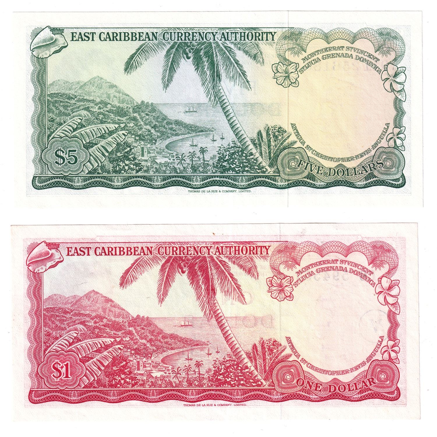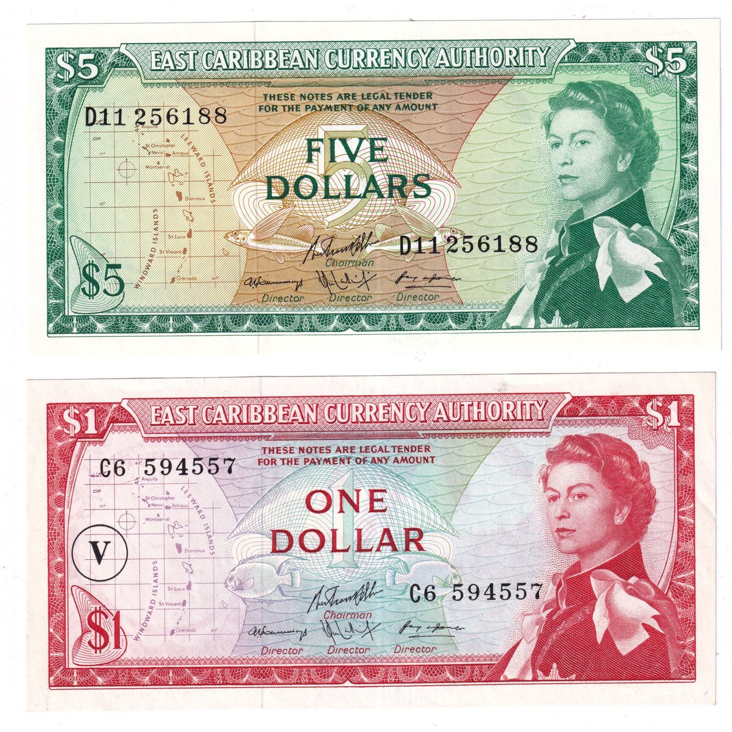 1965 East Caribbean States $1 Pick #13o & 1965 $5 Pick #14h Both in UNC Condition. 2pcs