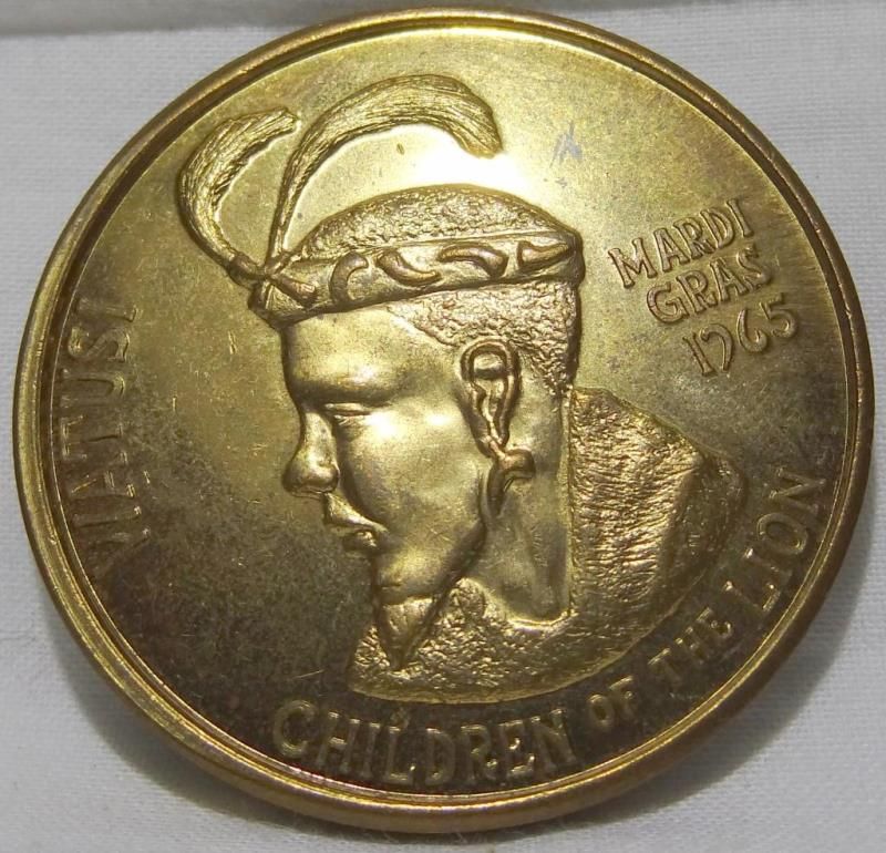 Here's the Extremely Rare 1965 Krewe of Zulu (HAS) Bronze Doubloon. The obverse features the Zulu (HAS) Logo. The reverse features a Watusi Tribesman and reads "WATUSI...CHILDREN OF THE LION...MARDI GRAS...1965." The doubloon measures 39 mm or 1 1/2" in diameter and is in Excellent Condition. Payment due within 48 hours of purchase. Note: This doubloon was designed by H. Alvin Sharpe, the creator of the Mardi Gras Doubloon and bears his familiar 'HAS' initials. Zulu issued their first doubloons in 1964 and 1965 was just the second year they issued doubloons, which were still a new concept to many krewe members. These doubloons were issued in very limited numbers and are extremely rare.