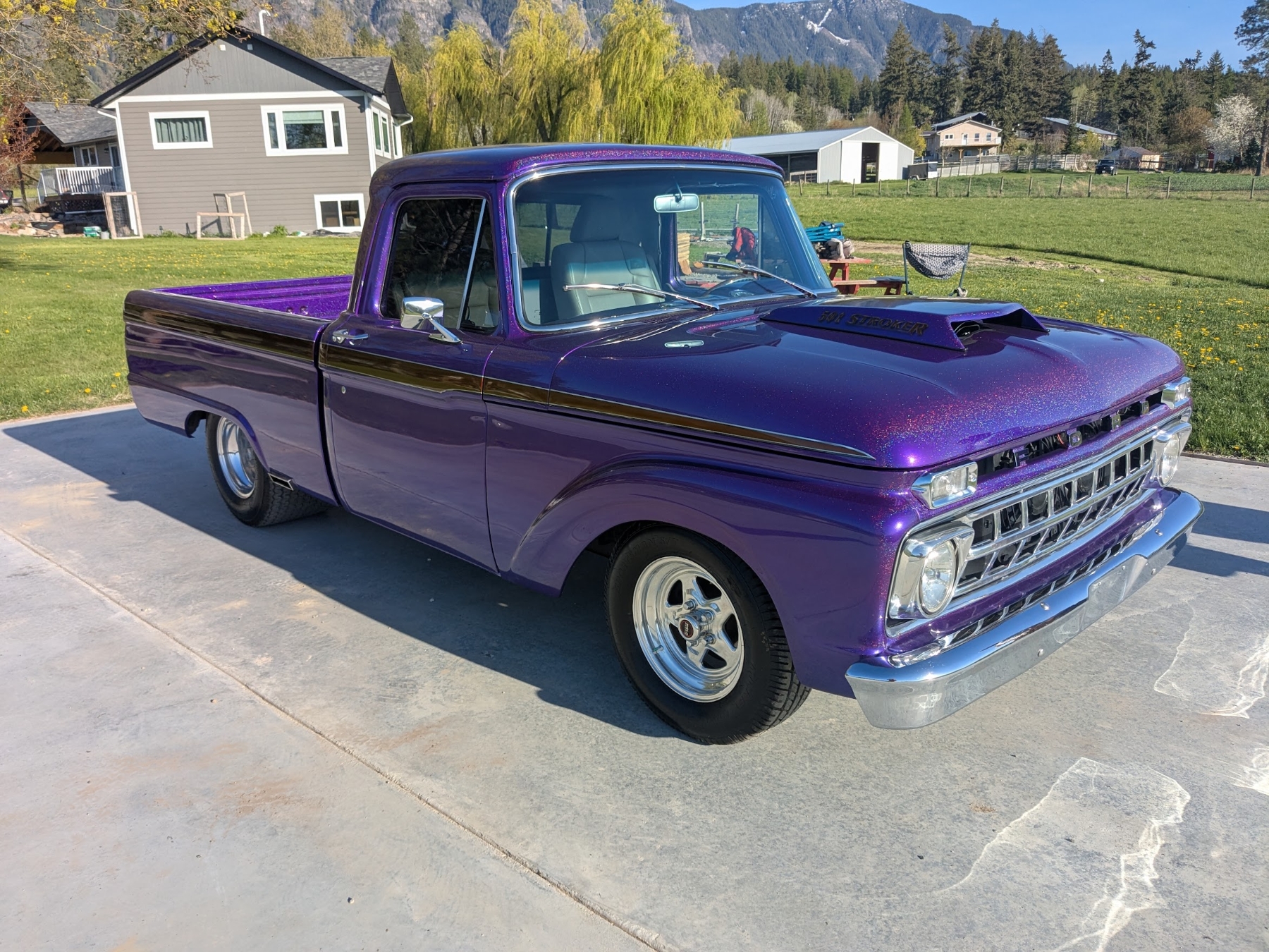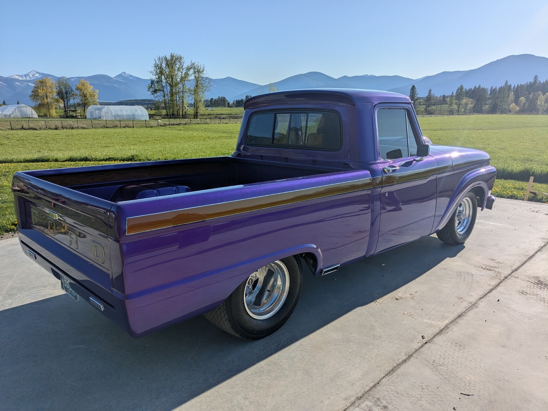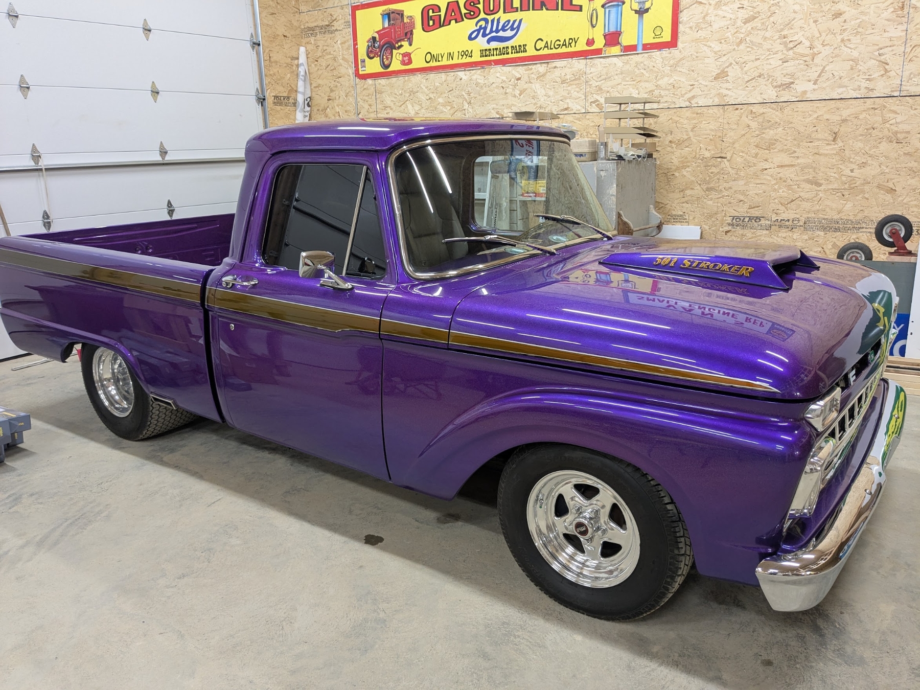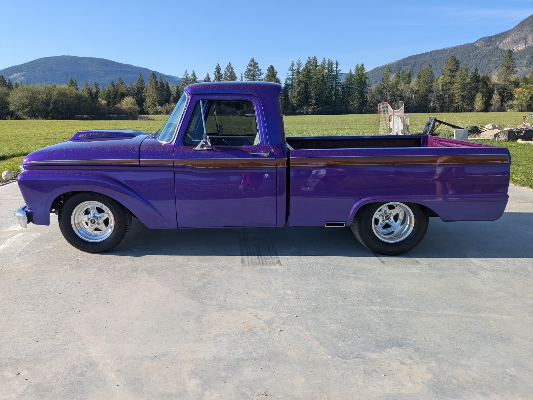 This 1965 Ford F-100 custom pickup is powered by a Ford 501ci engine modified with a 30-30 stroker kit, port and polished Super Cobra Jet heads, a Weiand high-ride tunnel Ram intake, two Holley 450 carburetors, a Gear Drive camshaft, custom 3-port air cleaner, a custom exhaust system with electric cutouts, 13-inch radiator cooling fans and a custom MSD ignition. This engine runs on premium fuel only and is paired with a manual transmission. Additional mechanical highlights include a 16-gallon fuel cell and a shortened 9-inch rear axle. This pickup rides on two Mickey Thompson Sportsman Pro street tires mounted on Weld Racing wheels. Exterior highlights include PPG Vibrance paint, a ported hood scoop and airbrushed graphics. The wheel wells were modified to fit the rear tires and are lined with West Virginia oak. The interior features gray leather seats with a center console, a 6-instrument cluster, a chromed tilt wheel steering column, a Pioneer WMA/MP3/USB/iPod stereo with under-seat amplifier and custom two-tone door panels with Ford logos. It also features controls for the rear air suspension and exhaust cutouts are in the dash. The seller states the speedometer is non-functional and the cable will need to be installed for the odometer. The pickup comes with over $70,000 in receipts.