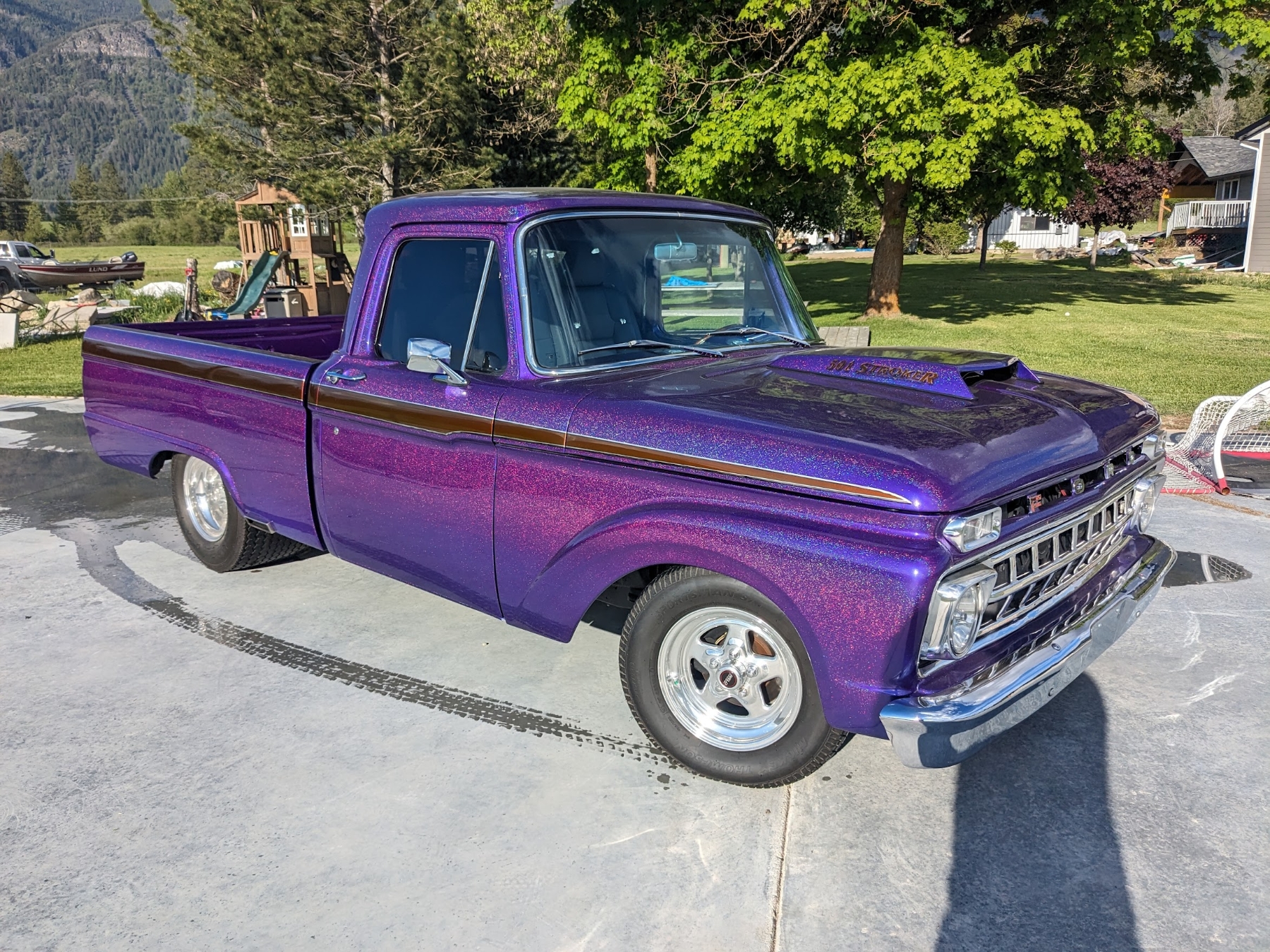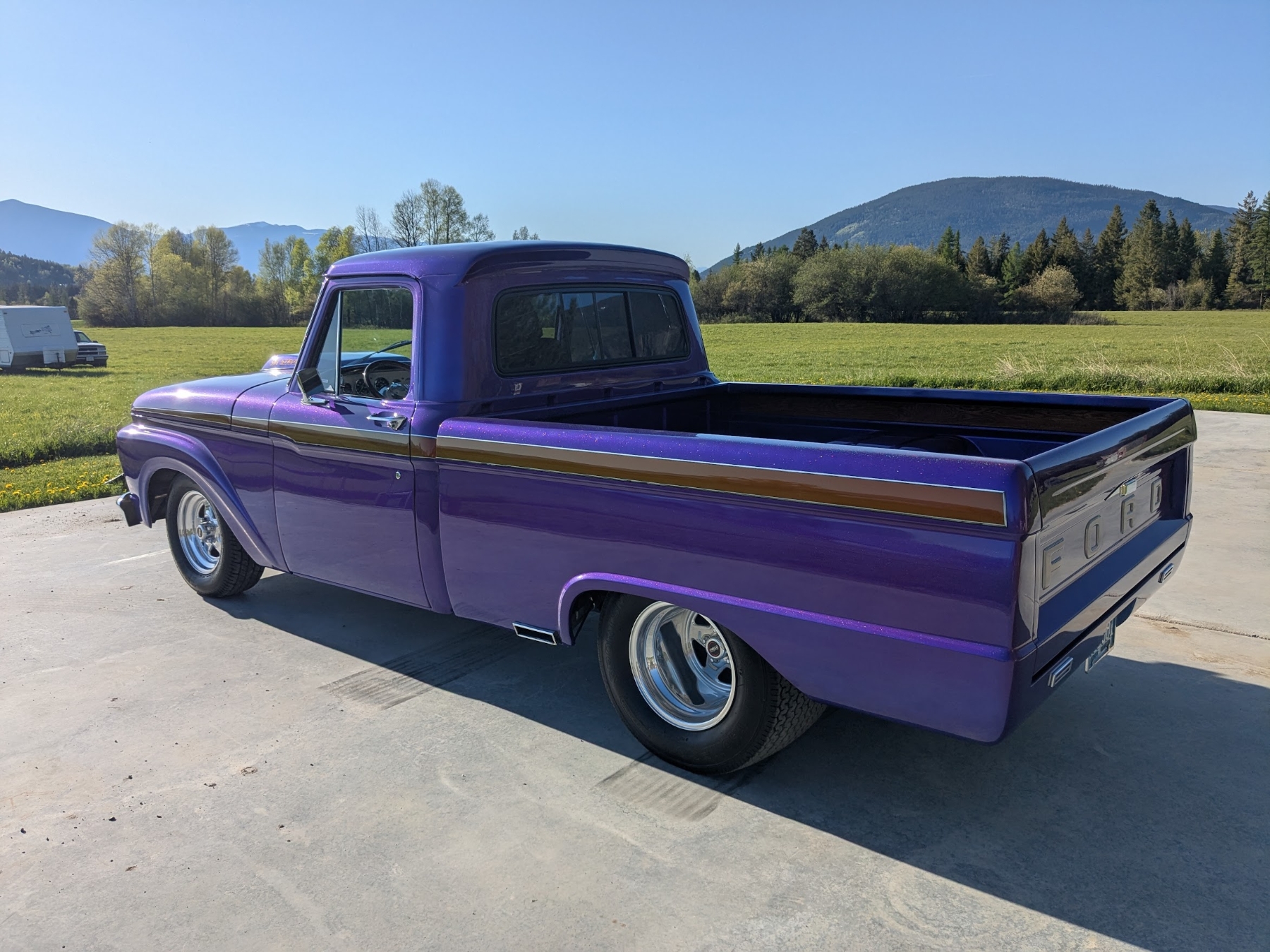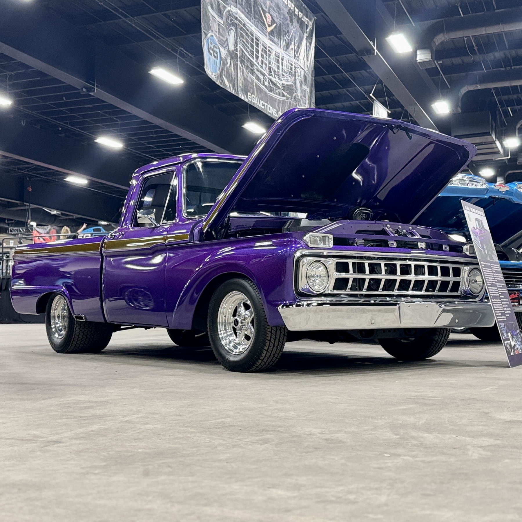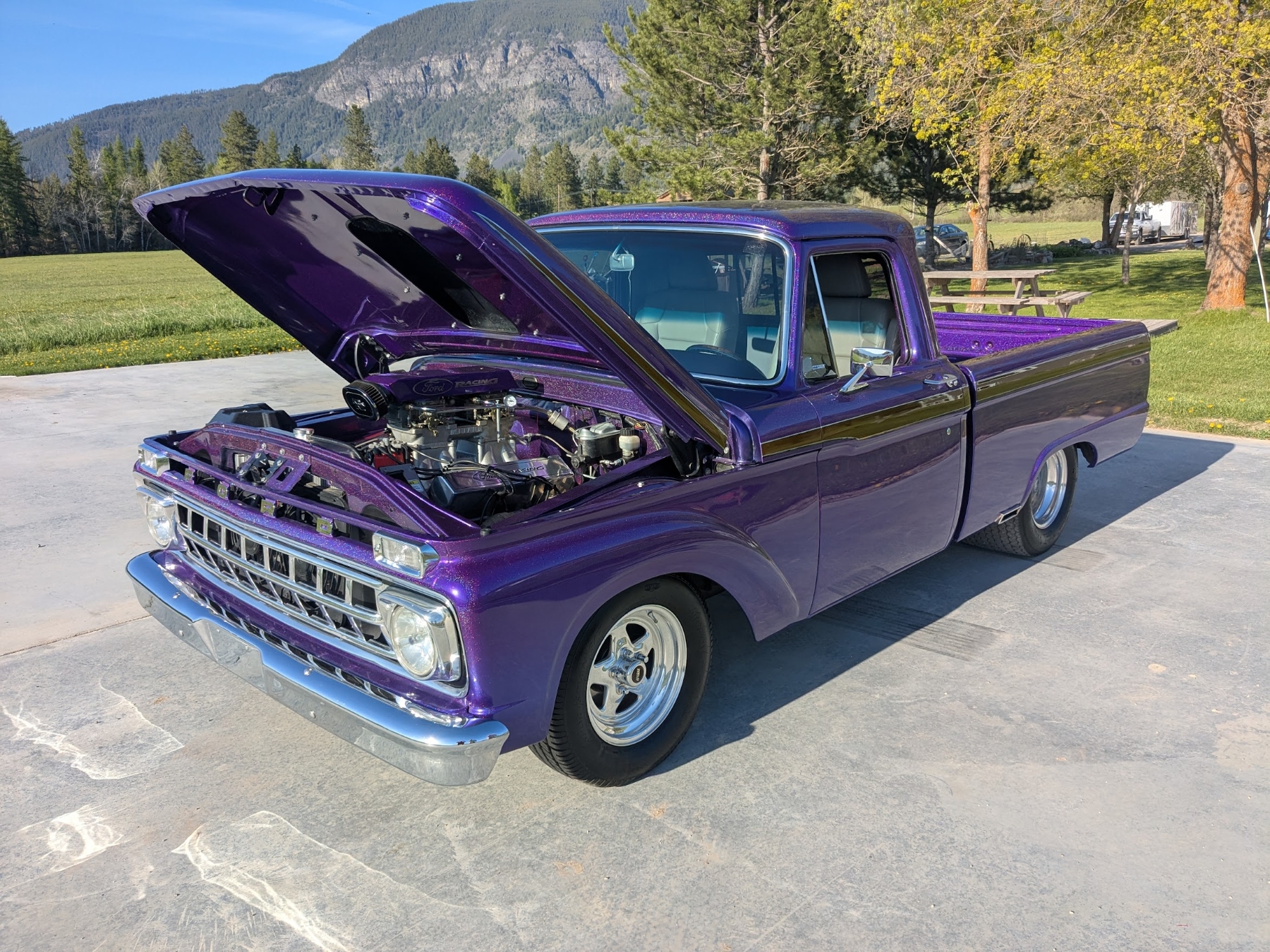 This 1965 Ford F-100 custom pickup is powered by a Ford 501ci engine modified with a 30-30 stroker kit, port and polished Super Cobra Jet heads, a Weiand high-ride tunnel Ram intake, two Holley 450 carburetors, a Gear Drive camshaft, custom 3-port air cleaner, a custom exhaust system with electric cutouts, 13-inch radiator cooling fans and a custom MSD ignition. This engine runs on premium fuel only and is paired with a manual transmission. Additional mechanical highlights include a 16-gallon fuel cell and a shortened 9-inch rear axle. This pickup rides on two Mickey Thompson Sportsman Pro street tires mounted on Weld Racing wheels. Exterior highlights include PPG Vibrance paint, a ported hood scoop and airbrushed graphics. The wheel wells were modified to fit the rear tires and are lined with West Virginia oak. The interior features gray leather seats with a center console, a 6-instrument cluster, a chromed tilt wheel steering column, a Pioneer WMA/MP3/USB/iPod stereo with under-seat amplifier and custom two-tone door panels with Ford logos. It also features controls for the rear air suspension and exhaust cutouts are in the dash. The seller states the speedometer is non-functional and the cable will need to be installed for the odometer. The pickup comes with over $70,000 in receipts.