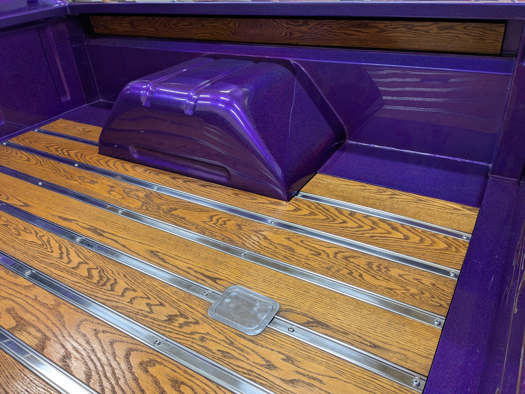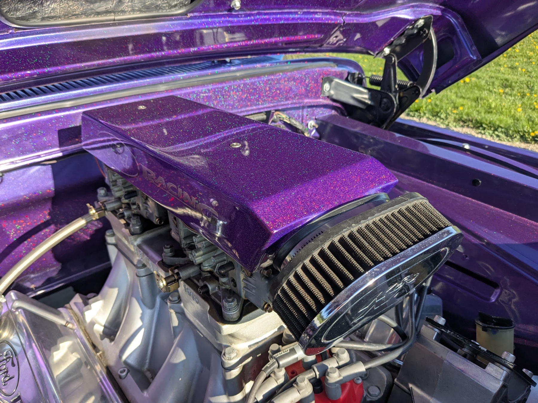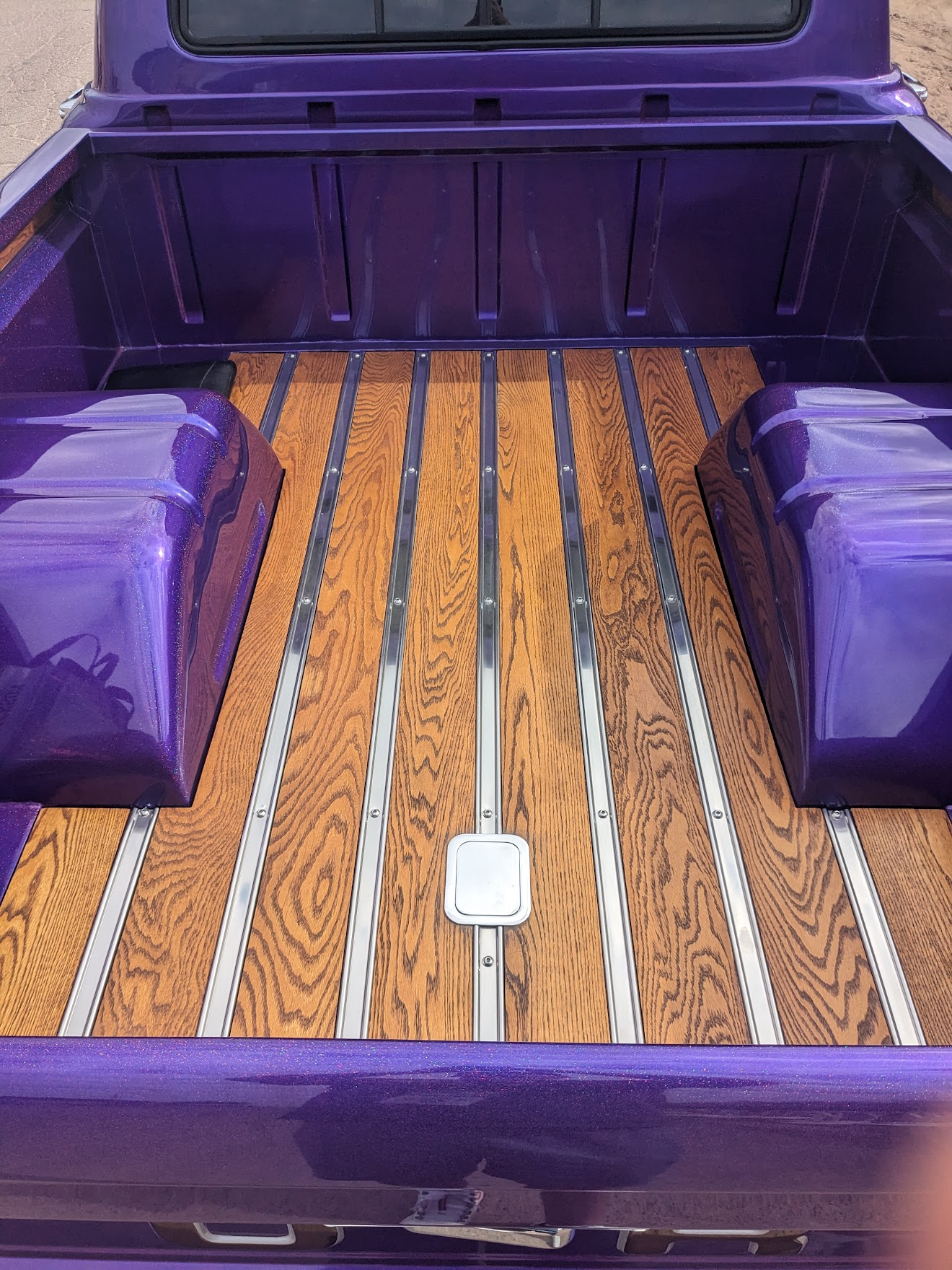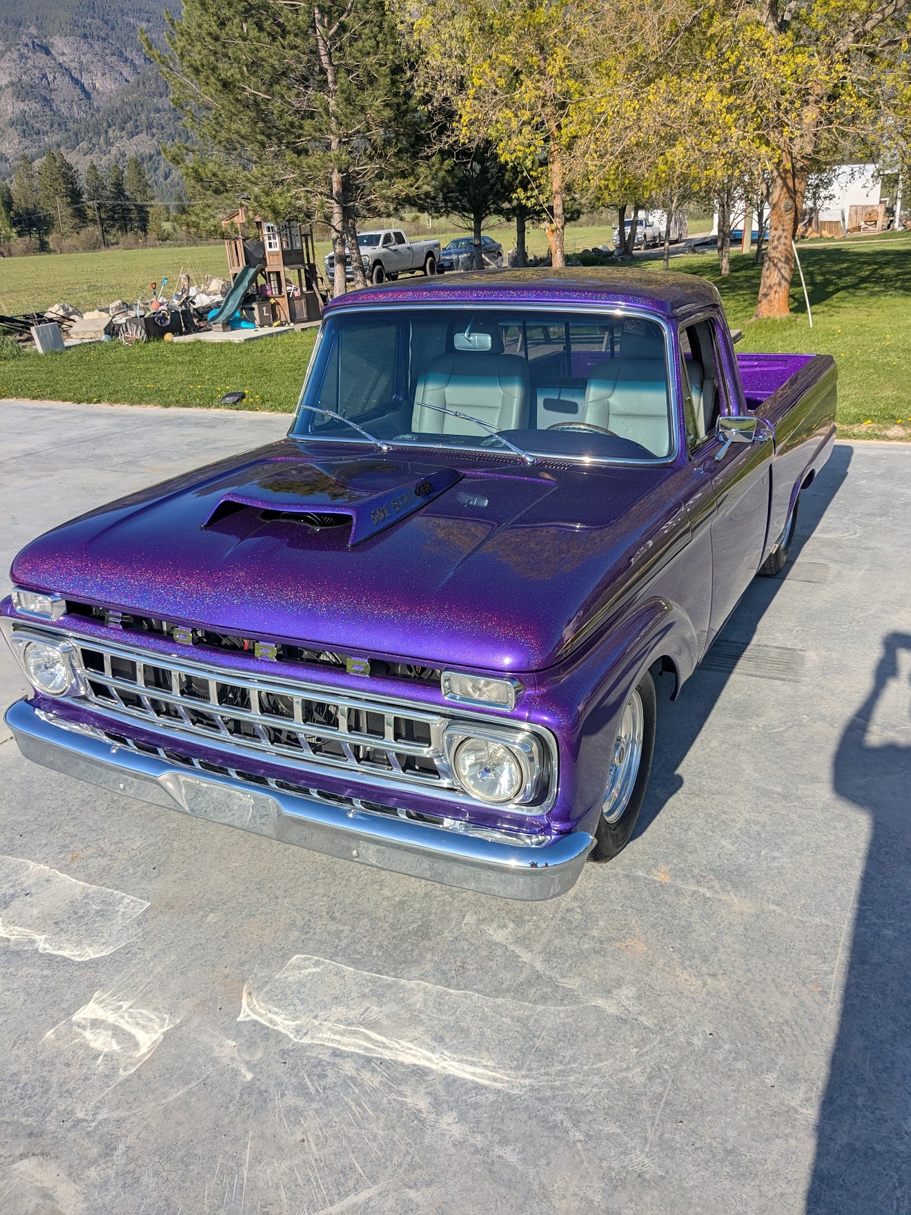 This 1965 Ford F-100 custom pickup is powered by a Ford 501ci engine modified with a 30-30 stroker kit, port and polished Super Cobra Jet heads, a Weiand high-ride tunnel Ram intake, two Holley 450 carburetors, a Gear Drive camshaft, custom 3-port air cleaner, a custom exhaust system with electric cutouts, 13-inch radiator cooling fans and a custom MSD ignition. This engine runs on premium fuel only and is paired with a manual transmission. Additional mechanical highlights include a 16-gallon fuel cell and a shortened 9-inch rear axle. This pickup rides on two Mickey Thompson Sportsman Pro street tires mounted on Weld Racing wheels. Exterior highlights include PPG Vibrance paint, a ported hood scoop and airbrushed graphics. The wheel wells were modified to fit the rear tires and are lined with West Virginia oak. The interior features gray leather seats with a center console, a 6-instrument cluster, a chromed tilt wheel steering column, a Pioneer WMA/MP3/USB/iPod stereo with under-seat amplifier and custom two-tone door panels with Ford logos. It also features controls for the rear air suspension and exhaust cutouts are in the dash. The seller states the speedometer is non-functional and the cable will need to be installed for the odometer. The pickup comes with over $70,000 in receipts.