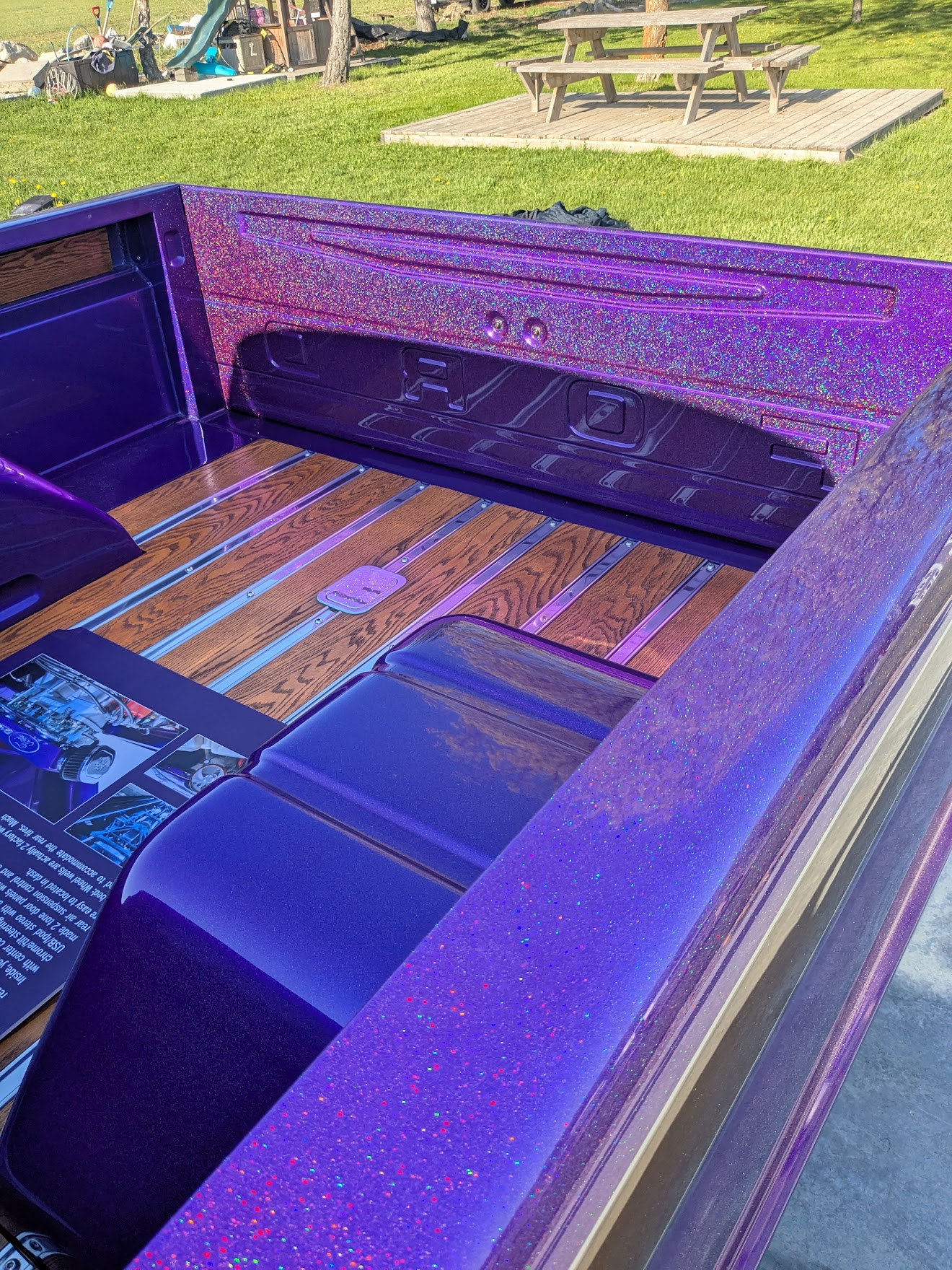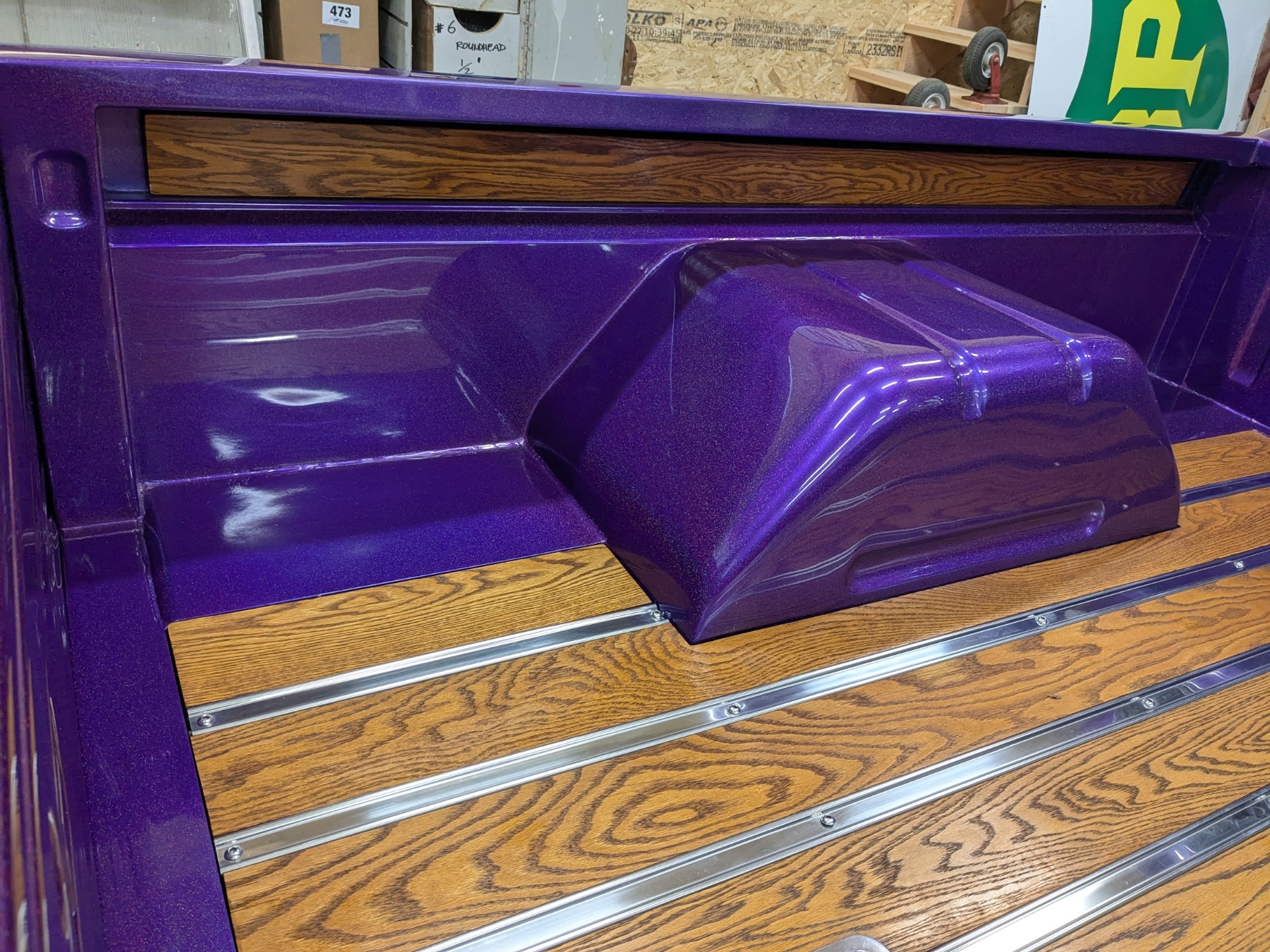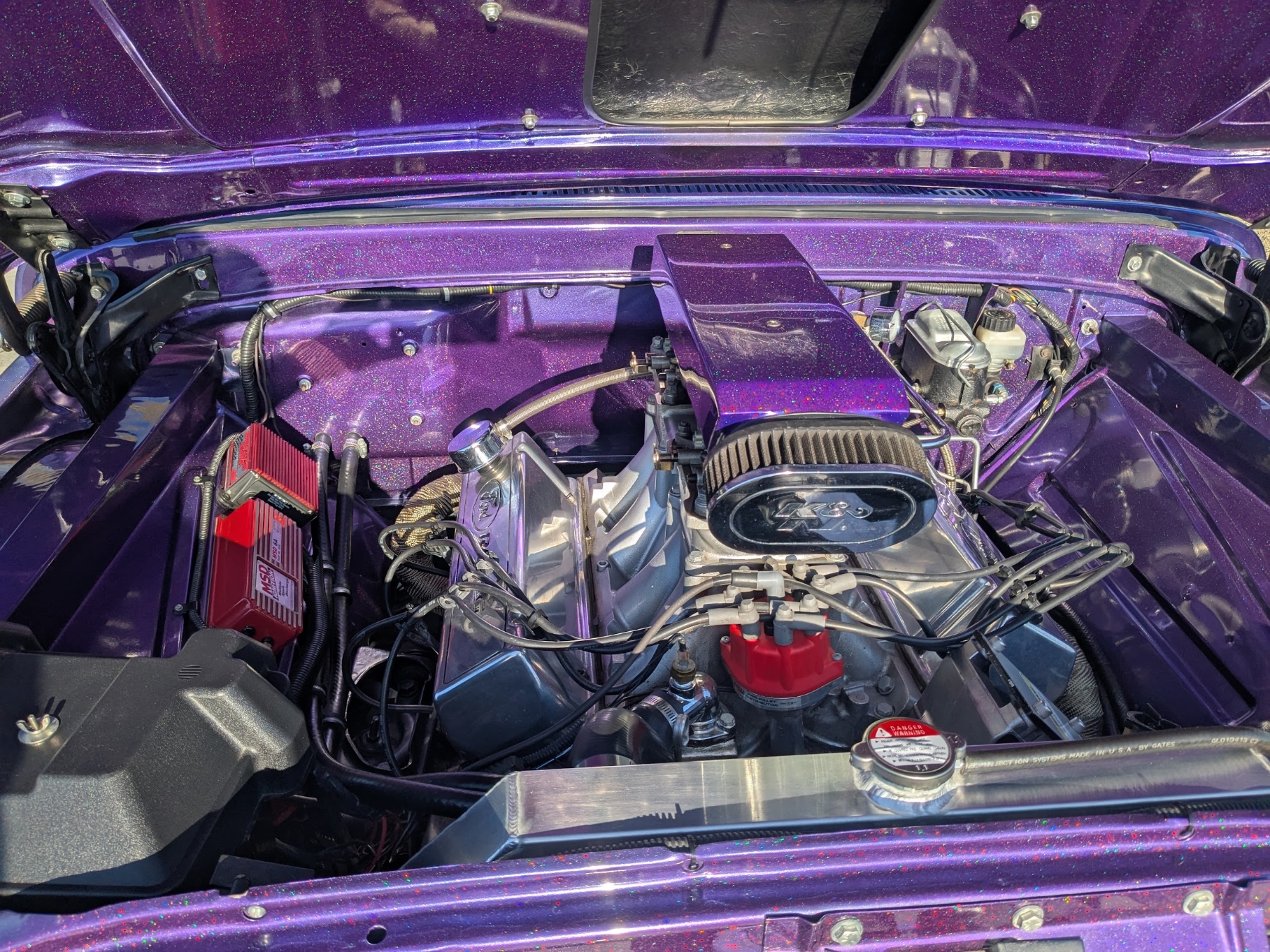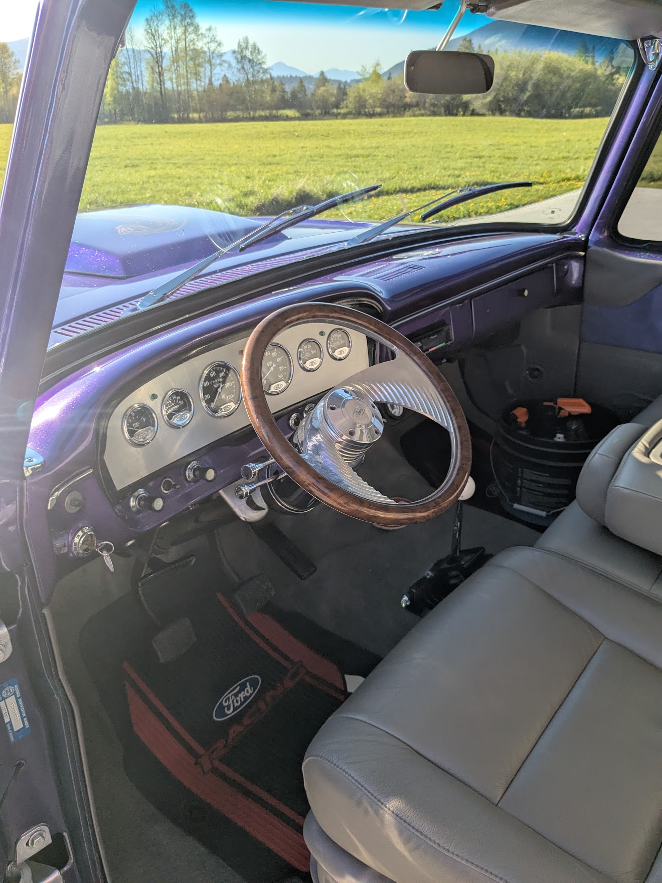 This 1965 Ford F-100 custom pickup is powered by a Ford 501ci engine modified with a 30-30 stroker kit, port and polished Super Cobra Jet heads, a Weiand high-ride tunnel Ram intake, two Holley 450 carburetors, a Gear Drive camshaft, custom 3-port air cleaner, a custom exhaust system with electric cutouts, 13-inch radiator cooling fans and a custom MSD ignition. This engine runs on premium fuel only and is paired with a manual transmission. Additional mechanical highlights include a 16-gallon fuel cell and a shortened 9-inch rear axle. This pickup rides on two Mickey Thompson Sportsman Pro street tires mounted on Weld Racing wheels. Exterior highlights include PPG Vibrance paint, a ported hood scoop and airbrushed graphics. The wheel wells were modified to fit the rear tires and are lined with West Virginia oak. The interior features gray leather seats with a center console, a 6-instrument cluster, a chromed tilt wheel steering column, a Pioneer WMA/MP3/USB/iPod stereo with under-seat amplifier and custom two-tone door panels with Ford logos. It also features controls for the rear air suspension and exhaust cutouts are in the dash. The seller states the speedometer is non-functional and the cable will need to be installed for the odometer. The pickup comes with over $70,000 in receipts.