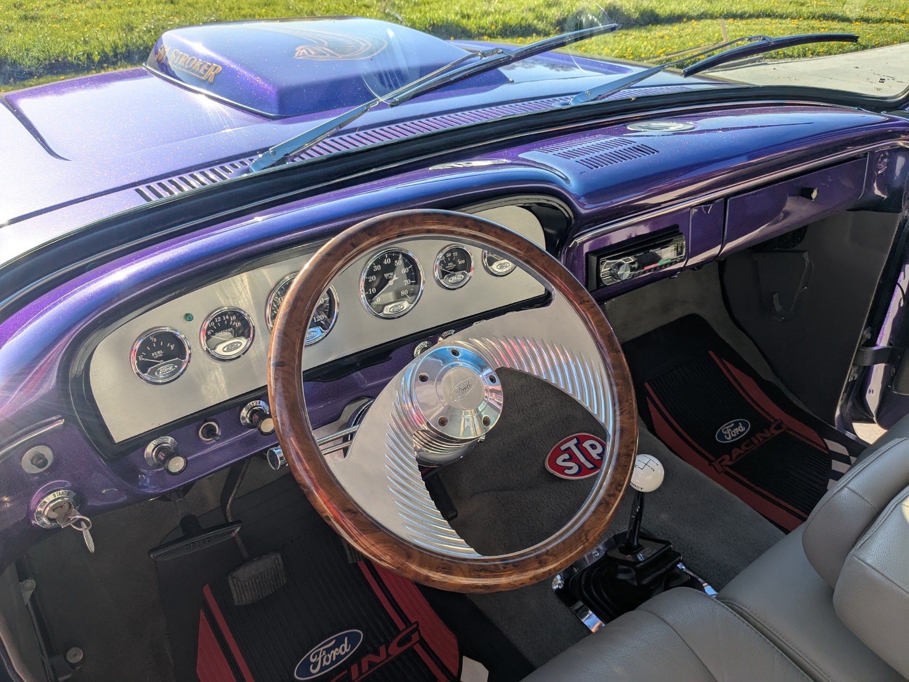 Powered by a Ford 501ci engine modified with a 30-30 stroker kit, ported and polished Super Cobra Jet heads, a Weiand high-ride tunnel Ram intake, two Holley 450 carburetors and more, paired with a 4-speed manual transmission. Titled as 1965 Ford Recon.