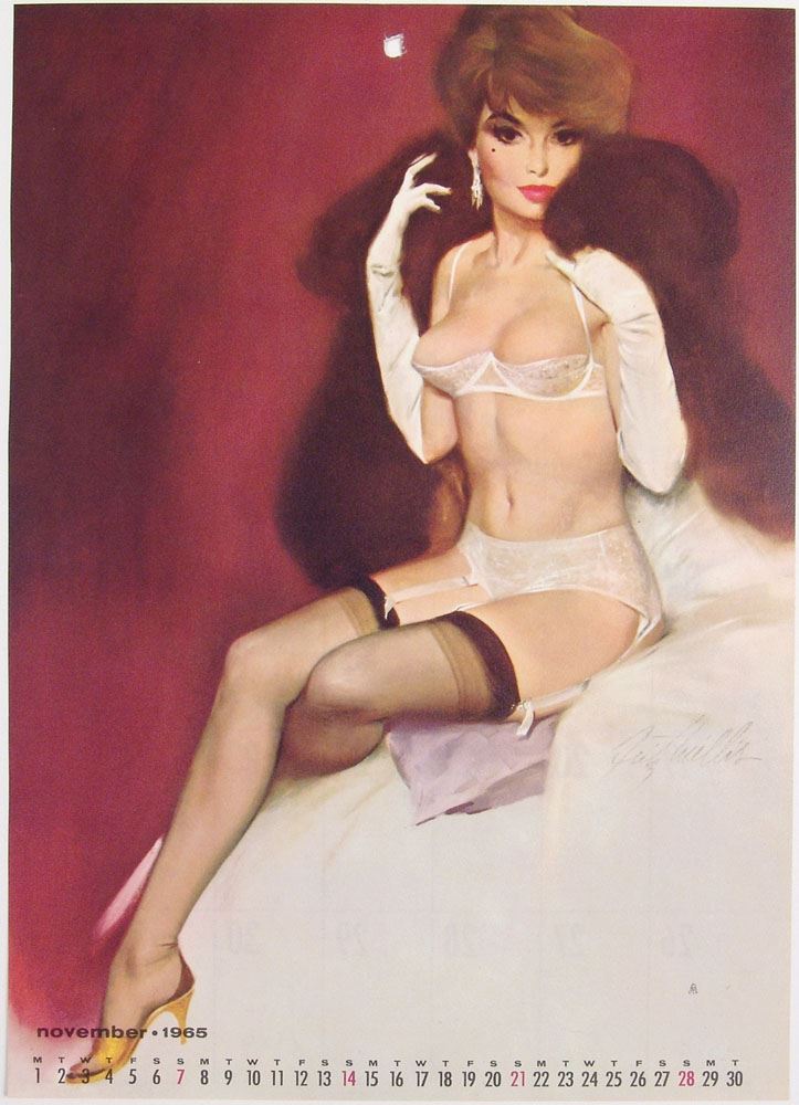 This is a vintage November, 1965 page from a Brown & Bigelow calendar featuring a risque pin-up print by Fritz Willis. SIZE: Approx. 8 1/2" x 12".