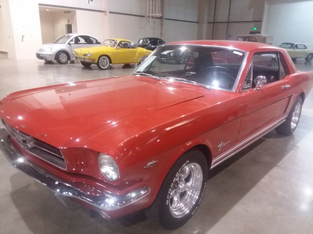 1965 Ford Mustang Coupe. 289 cid engine. Factory C code V8 from the factory. C4 automatic transmission. Power steering. Power brakes. Dual exhaust system. Porsche Red with black stock interior