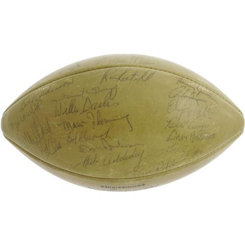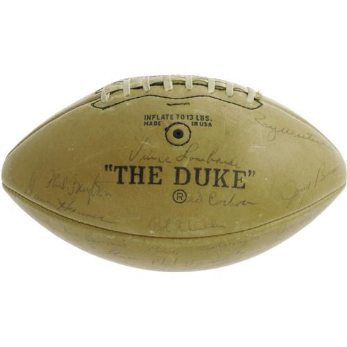<B>1965 Green Bay Packers Team Signed Football.</B></I> After three years of World Championship drought, Vince Lombardi's hardnosed Packers returned to their rightful place atop the NFL heap in 1965. Assembled on this Official NFL "The Duke" ball are the signatures of forty-eight of the champagne-drenched victors, most notably Lombardi, Jordan, Starr, Nitschke, Davis, Gregg, Adderley, Kramer, Taylor, Wood, McGee and Pitts. Signature quality is a bold and consistent 7/10 to 9/10, with every last name clearly legible. Ball itself is still fully inflated and shows some minor wear but still presents wonderfully. <I>LOA from PSA/DNA.</B></I> <BR><BR><B>Important notice:</B> Heritage usually auctions material at the rate of 200-250 lots per hour. On some occasions eBay Live bid software or the Internet may not be able to keep up with the pace of the auction. We recommend placing a realistic absentee bid now as insurance to avoid disappointment. Occasionally the auctioneer may eliminate or reject an eBay Live bid, and the auctioneer may also reopen a lot after the close of the eBay live bidding (usually because we missed an audience bid), and may reject your bid even if it shows you as the winning bidder. By bidding via eBay Live, you agree that Heritage may award the lot to another bidder at its sole discretion under the circumstances described above or any other reasonable circumstances. Since eBay bids are not shown to us until we open the lot on the floor, we treat those bids just like floor bids. In most cases the floor responds before the eBay bid is presented to us, due to Internet lag time, so for consistency we have made it a policy that floor bids are always considered first over tie eBay live bids. Also please note that all Heritage lots purchased through eBay Live carry a 22.5% Buyer's Premium. Please make sure you read the Terms and Conditions before you bid. This lot is being auctioned in conjunction with a live floor auction by Heritage Galleries & Auctioneers. All final auction and invoice information will be supplied by Heritage Galleries & Auctioneers, and all other information should be considered preliminary. Lot:19306 <BR><BR><B>Winning Notification and Billing:</B> After the FINAL session in this auction is complete, Heritage will send e-mail and snail mail invoices. This process normally takes several days. All final auction and invoice information will be supplied by Heritage Galleries & Auctioneers, and all other information should be considered preliminary. <BR><BR>This auction will be conducted on a live auction floor and over the Internet through eBay Live. If you choose to place an absentee bid, please take a moment to <font color='#0000ff'><u><a href='http://pages.ebay.com/liveauctions/help/before/laabsentee.html'>learn how eBay Live absentee bidding works</a></u></font><font color='#000000'>