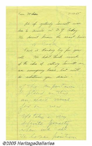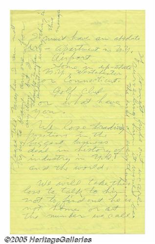 <B>1965 Howard Hughes' Letter to Assistant Bob Maheu</B></I> In the 1950s, ex-FBI special agent Bob Maheu worked for Howard Hughes on an assignment basis, thwarting blackmailers, spying on Hughes' girlfriends and acting as his personal emissary. By 1961, Maheu had moved to Los Angeles from Washington, D.C. to become Hughes' full-time surrogate and main dealmaker with a salary of $520,000 and an unlimited expense account. Maheu once said about their relationship <I>"He decided that he wanted me to become his alter ego so he would never have to make a public appearance."</B></I> Amazingly, throughout their 13 year association, they never met face-to-face! Communications were always by phone or memo. Offered here is one such memo dated November 13, 1965 on a sheet of lined yellow legal paper. It starts out (in a secretarial hand): From Maheu... <I>"As of yesterdy [sic] Sonnett was due to arrive in N.Y. today. He doesn't know the exact time. Davis is standing by for your call. He didn't think much of the idea of calling Sonnett on an emergency basis, but will do whatever you desire."</B></I> ("Davis" was Chester Davis, Hughes' attorney). The rest of the front and all of the back of this sheet is in Howard Hughes own hand. He writes in part: "<I>I must have an absolute fix -- Apartment in N.Y. Airport Home in up-state N.Y., Westchester, of Connecticut. Golf Club or what have you. We lose trading positions in the biggest business deal in history of industry in U.S. and the world.</B></I>" He might have been referring to the sale of TWA stock here. Hughes goes on: <I>...Please tell Mayheu [sic] I am not trying to blame anyone for anything, but I thought Mayheu [sic] understood everything in this message. If Sonnett finds out we are surveiling [sic] him it would be the end of everything."</B></I> Pretty cloak-and-dagger sounding, wouldn't you say? Hughes has written his comments along both horizontally and vertically, actually quite messy. A rare document that gives a fascinating look into the business dealings of the billionaire recluse. Transcript included. <I>Accompanied by COA from PSA/DNA.</B></I> Lot:254