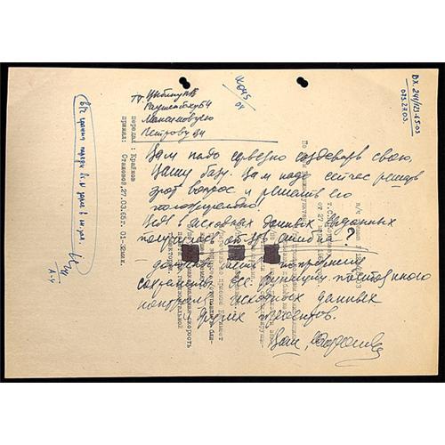<Our item number 139831><B>1965, Korolev Handwritten Note on a Telephonegram Message.</B> This is a rather lengthy, motivational note from the Soviet Chief Engineer. It is unusual as Korolev was always rushed for time and wrote mainly short, terse notes. This one reads: "To C(omrades) Tsybin, Raushenbakh, Maximov, Petrov. You must seriously build up your own base. You must solve this question now, and solve it positively! Again you obtained a mistake in your starting data?…must be kept everything: functions of permanent control and other projects. Yours S. Korolev". Given the secret and paranoid nature of the Soviet space program. Korolev notes, when available, are a glimpse into the hidden thinking behind the program. <BR>Estimated Value $1,000 - 1,500. <BR><BR>Our item number 139831<BR><IMAGES><P ALIGN="CENTER"><IMG SRC="http://www.goldbergcoins.net/liveauction/49jpegs/139831.jpg"> </P></IMAGES>