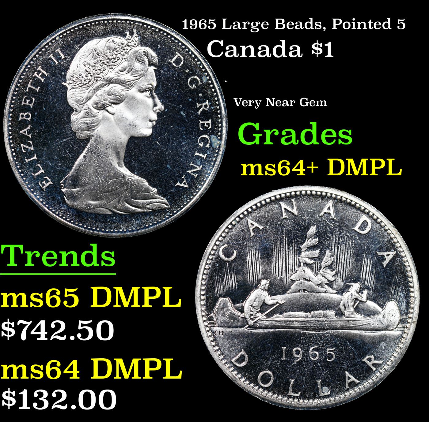 1965 Large Beads, Pointed 5 Canada Dollar $1 Grades Choice Unc+ DMPL.