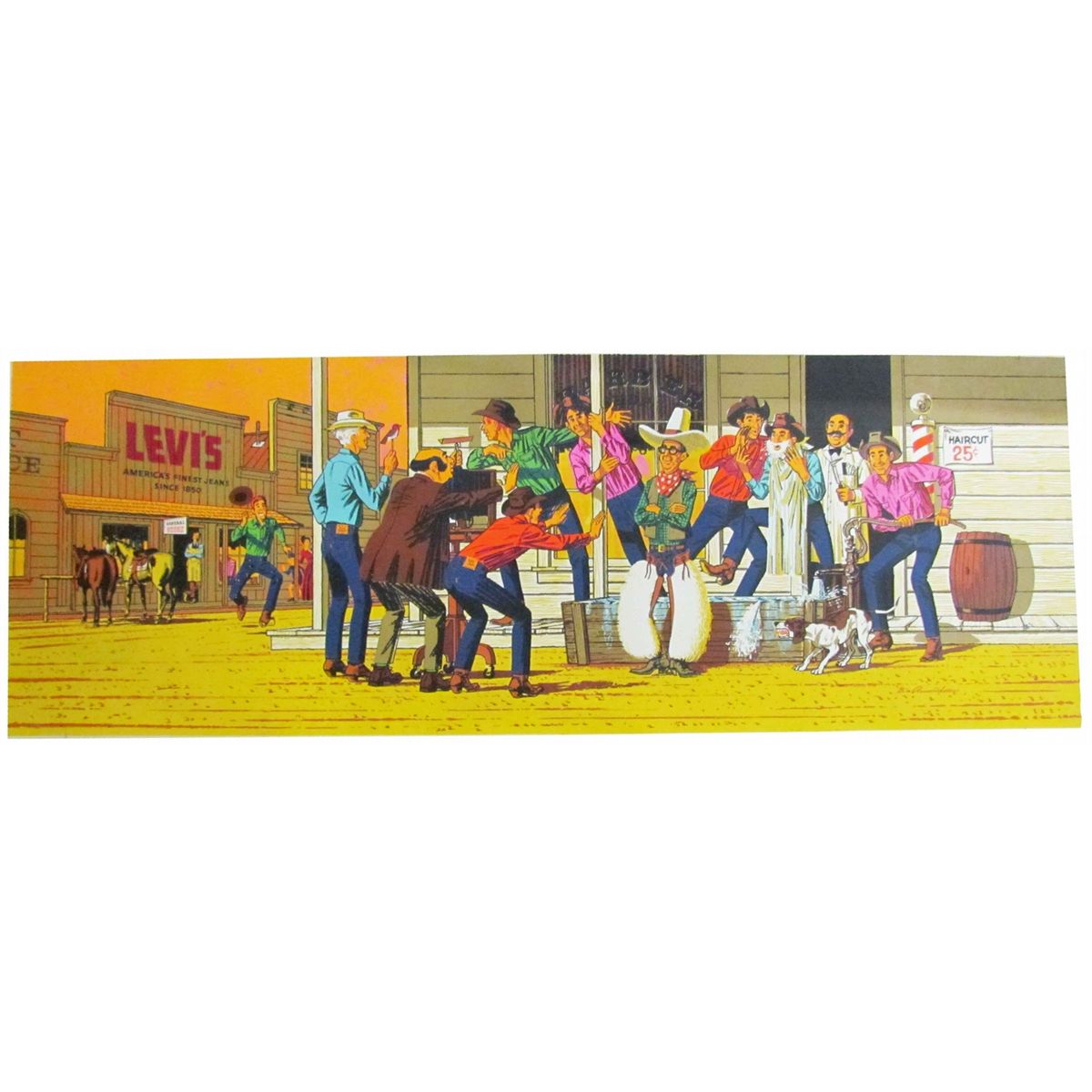 1965 Levi "Cor-Pix" Corrugated Paper Banner. Depicting Barber Shop and cowboys, comes in original shipping box. Near mint condition. Image measures 94 X 34 inches.