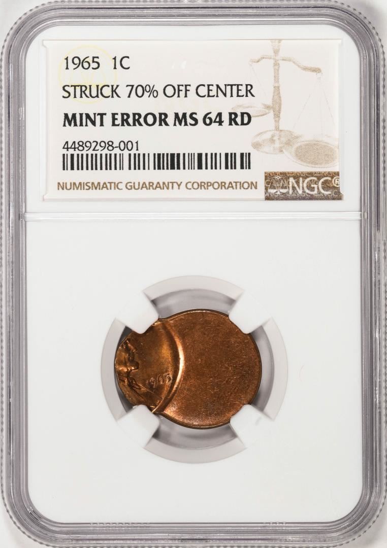 One 1965 Lincoln Memorial Cent Coin Struck 70% Off Center NGC Mint Error MS64RD. NGC Certified.