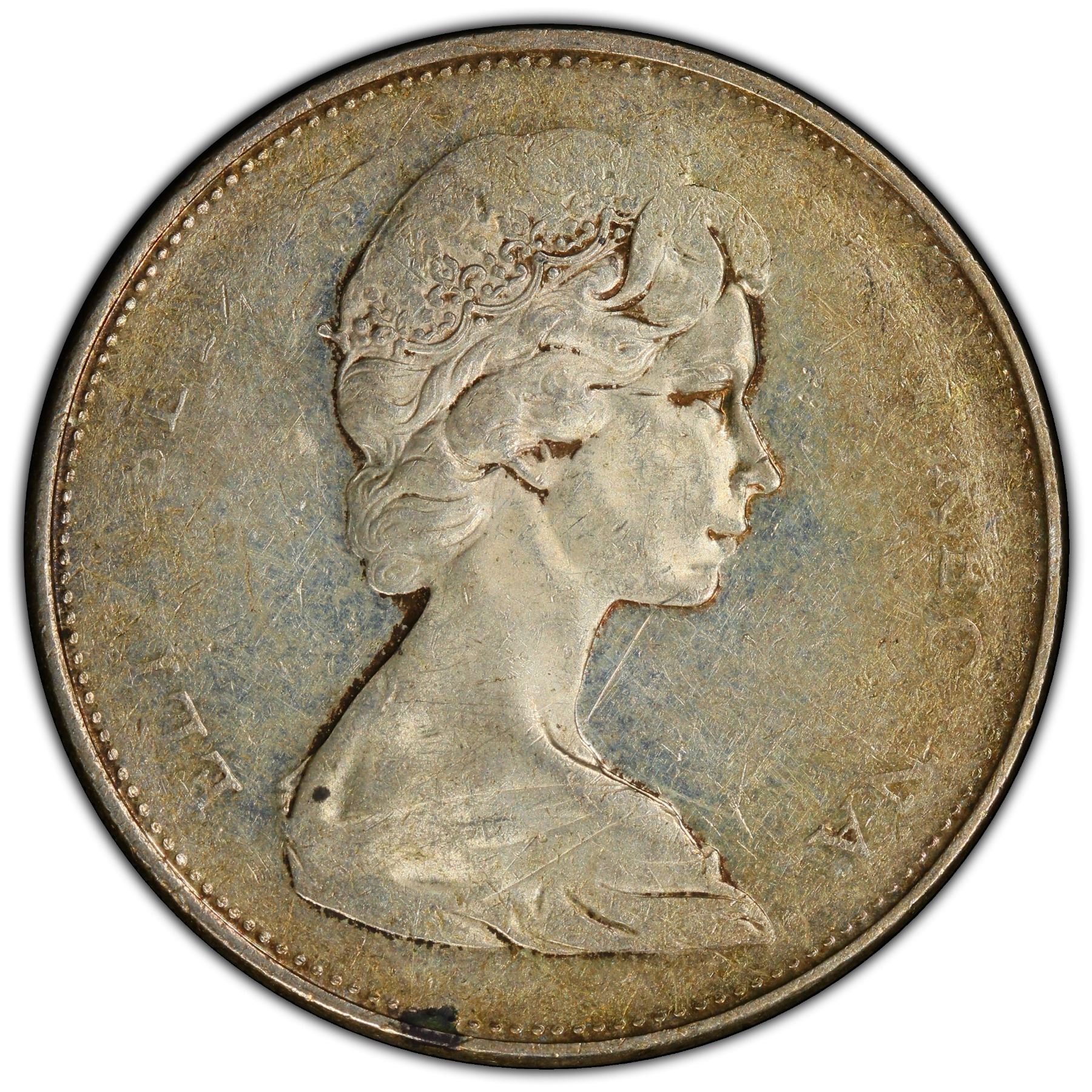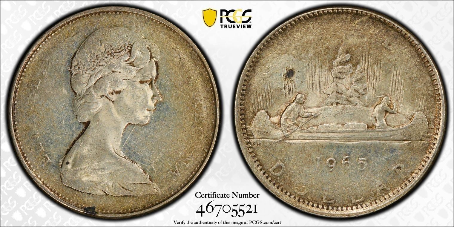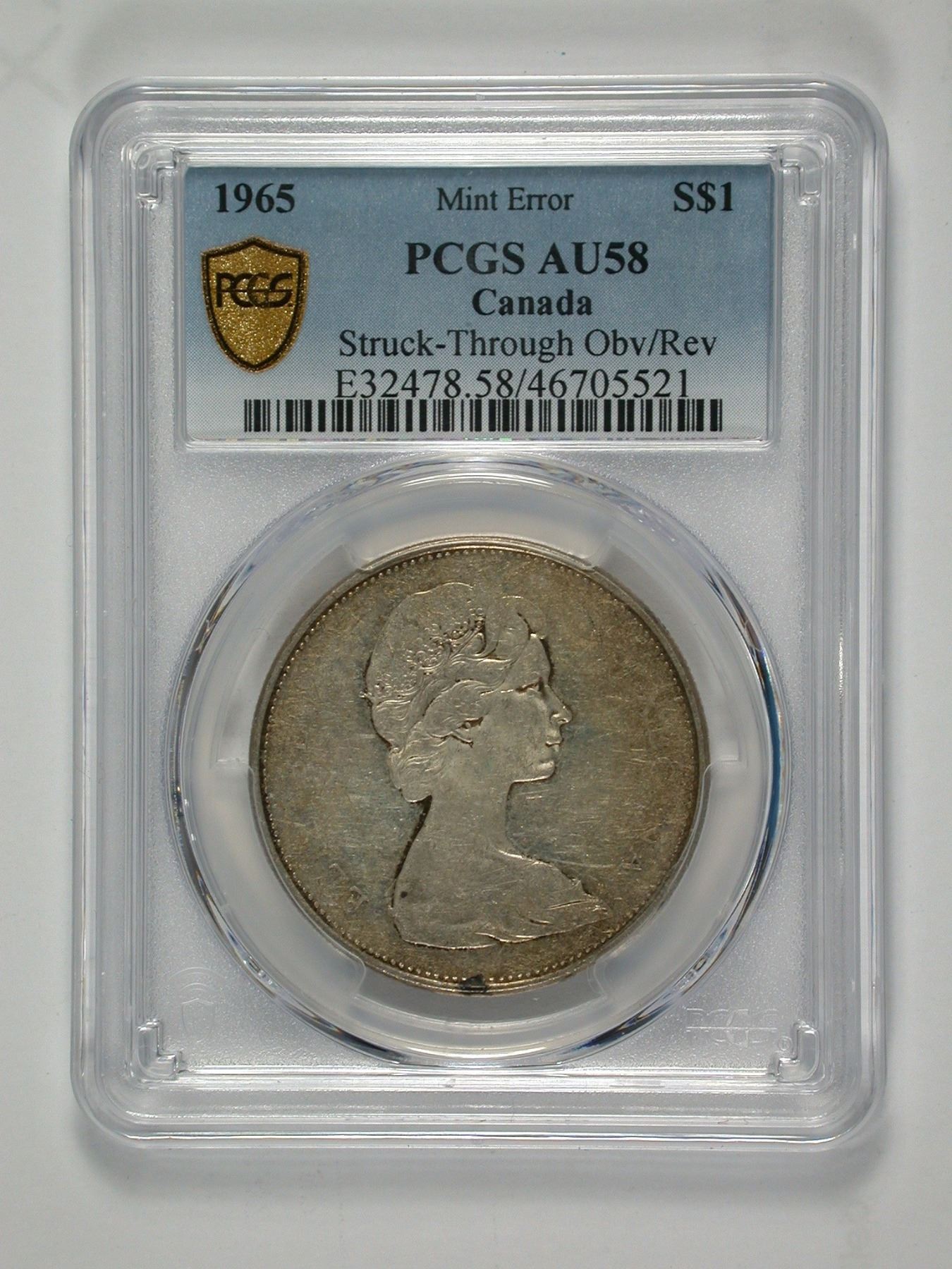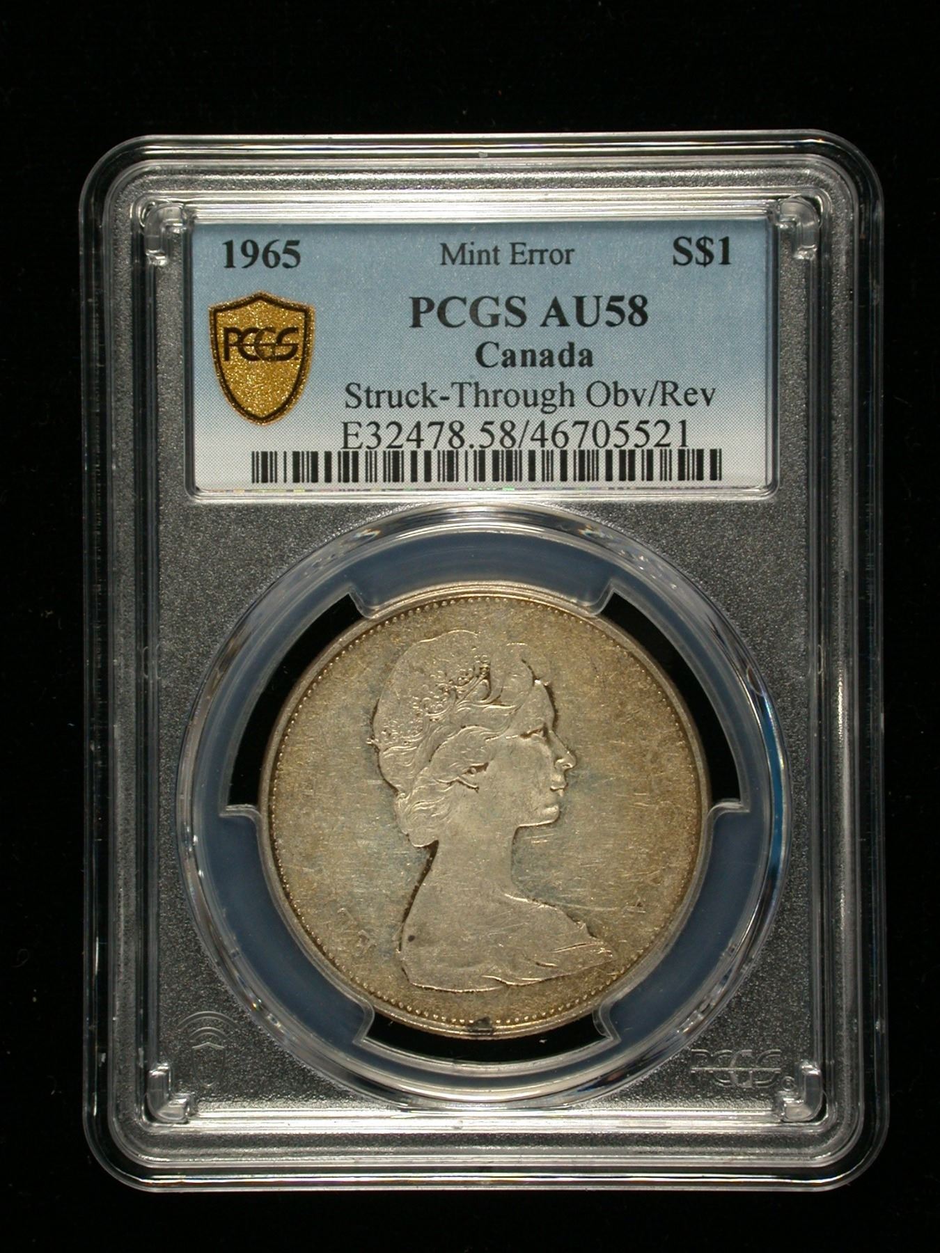 Canada One Dollar 1965, a Struck Through error resulting in substantial loss of most peripheral text on both obverse and reverse. PCGS AU-58, and a fairly dramatic example for the type