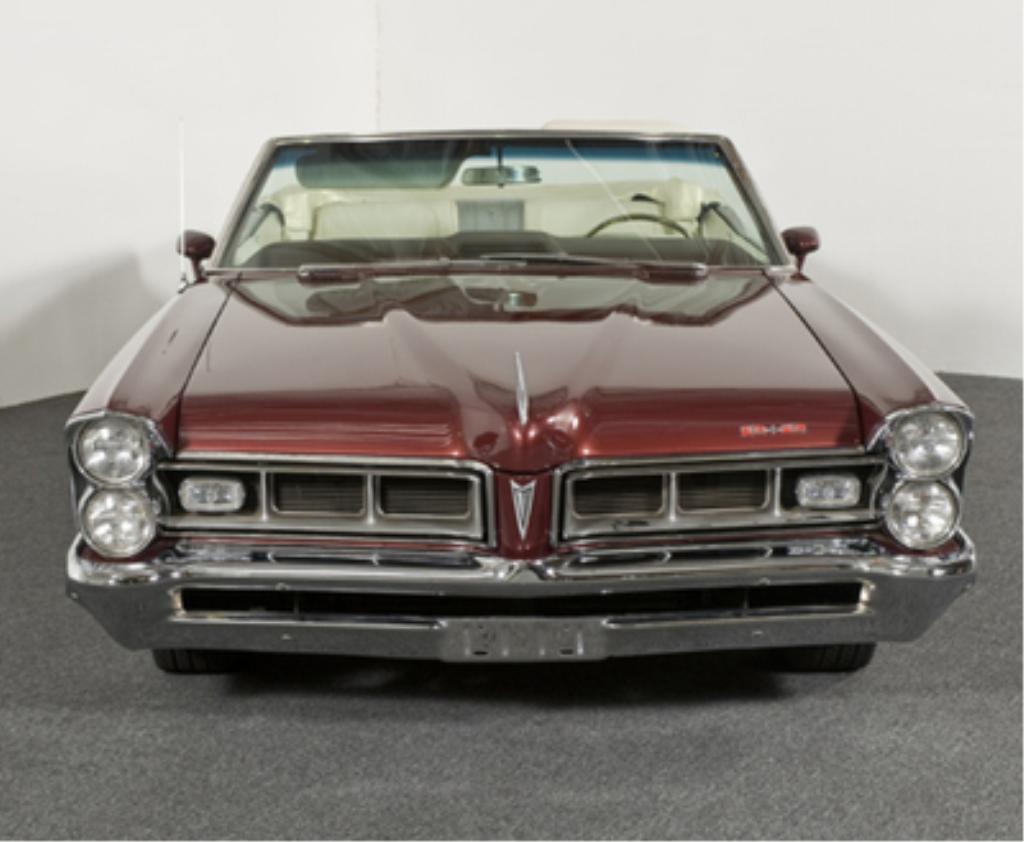 1965 Pontiac Catalina 2+2 421 Tri-Power Convertible 389 cid overhead valve V8 engine rated at 356 horsepower, three two-barrel carburetors, four-speed manual transmission, coil springs and shocks with rear leaf spring suspension and four-wheel drum brakes; wheelbase: 121"-During the glory days of the early muscle car years, most high performance packages were delegated to the midsized cars thereby taking best advantage of the power-to-weight equation. However, the packages were also available to the full-sized cars, which allowed for a great ride with tons of power. This Catalina came from the factory with the 2+2 package which included the bigger displacement 421 motor and was then further upgraded to the tri-power three-two barrel package. In addition, this convertible has a four-speed transmission, air-conditioning, eight-lug wheels, and is fully documented by Pontiac Historical Services. The paint is a magnificent maroon and is complemented with a parchment bucket seat interior. Only a small percentage of Catalinas received the 2+2 package in 1965 and less than half of those had a