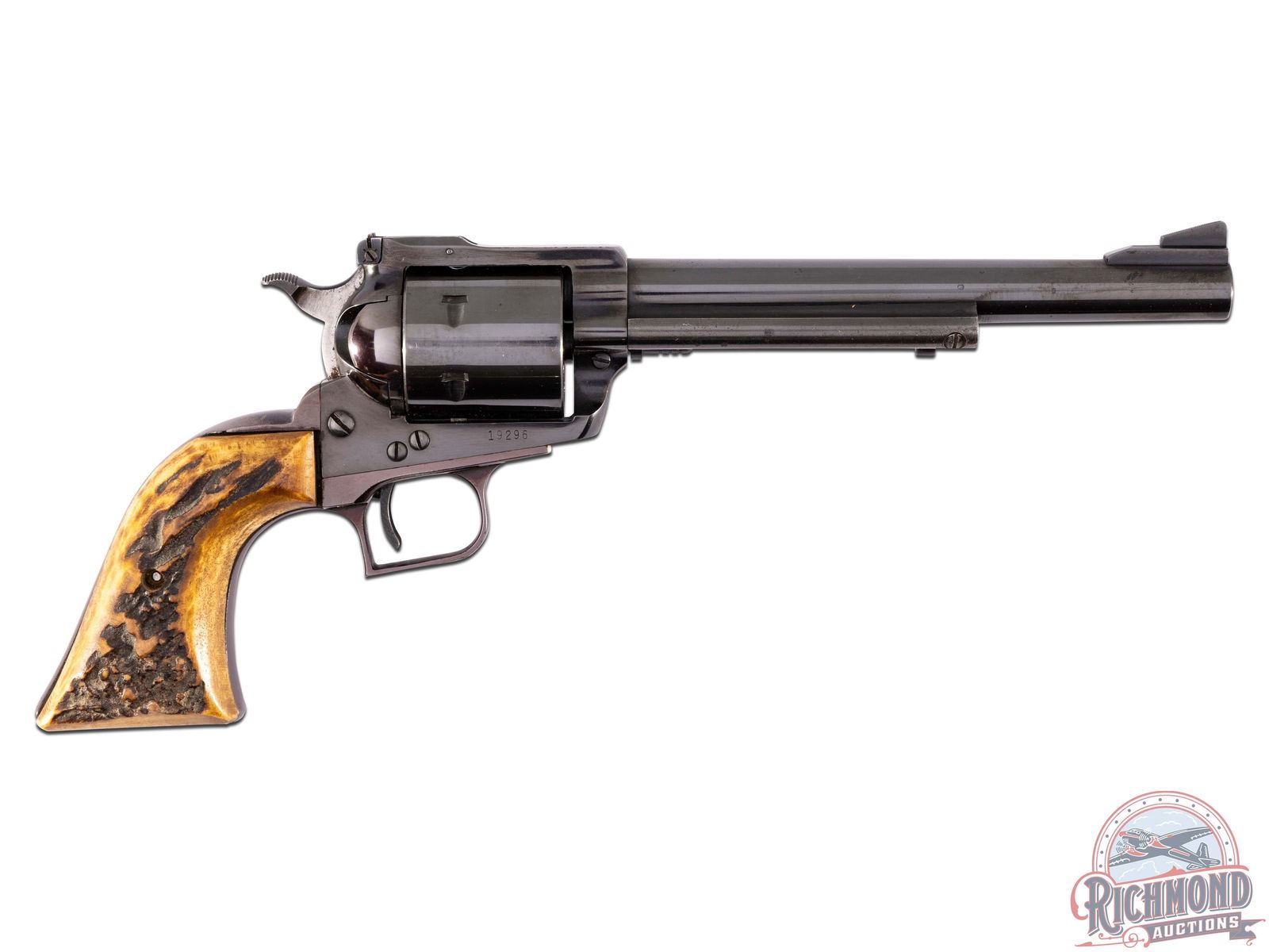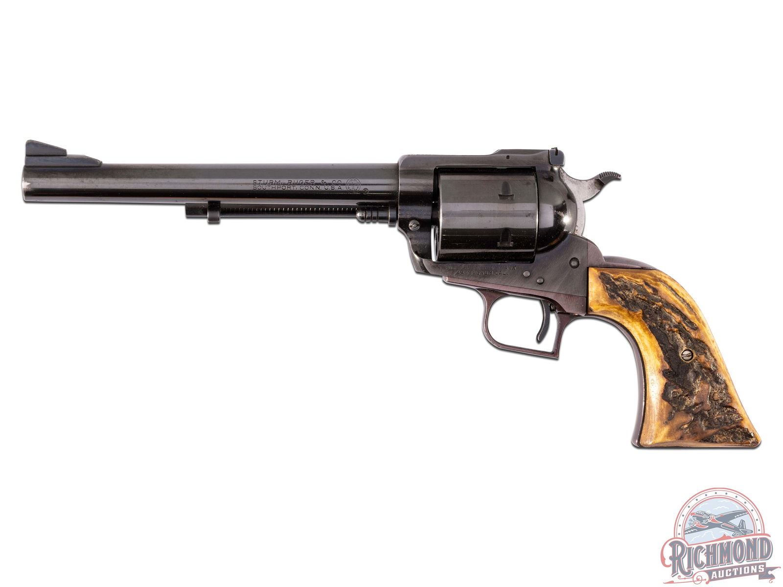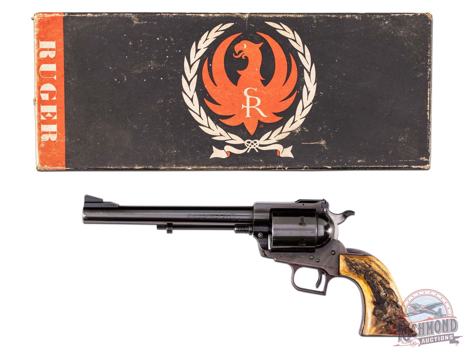 Manufactured in 1965, this Super Blackhawk has a low serial number. Features a 7-1/2" blued barrel with ramp blade front sight and rear adjustable notch sight. Left side of the barrel is stamped "STURM, RUGER & CO / SOUTHPORT, CONN. U.S.A." with the Ruger Phoenix logo. Blued receiver and 6 round non-fluted cylinder. Left side of the frame is stamped "RUGER SUPER BLACKHAWK / 44 MAGNUM CAL". Nice stag grips, written on the inside; '87. Comes in the original black and red factory box. CALIBER: 44 MAG. S/N: 19296. FFL STATUS: Curio & Relic.